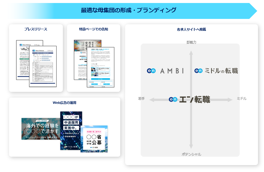 プレスリリースや特設ページ、Web広告での告知に加え、各求人サイトでの集客支援を実施。『ミドルの転職』『AMBI』『エン転職』とターゲットの異なる求人サイトを活用することで、ターゲットへ網羅的に求人を届けます。