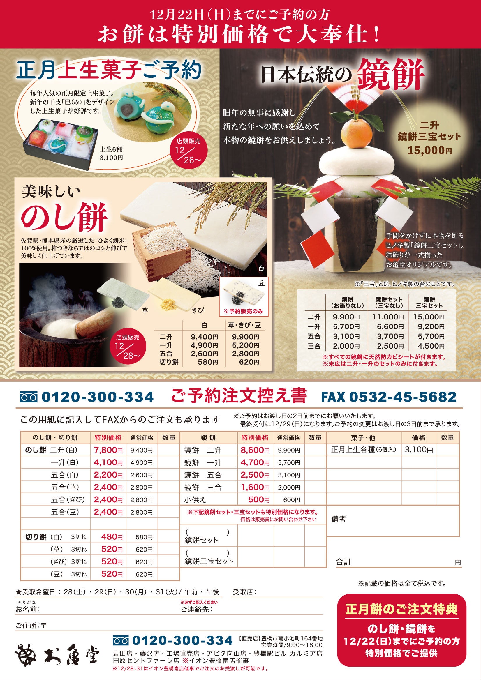 創業75年、愛知県三河の老舗和菓子店・お亀堂(本社:愛知県豊橋市、代表取締役:森貴比古)は、2026年の新年を迎えるにあたり、“本物の手づくり鏡餅”と“お飾り一式が揃った三宝セット”の販売を開始しました。