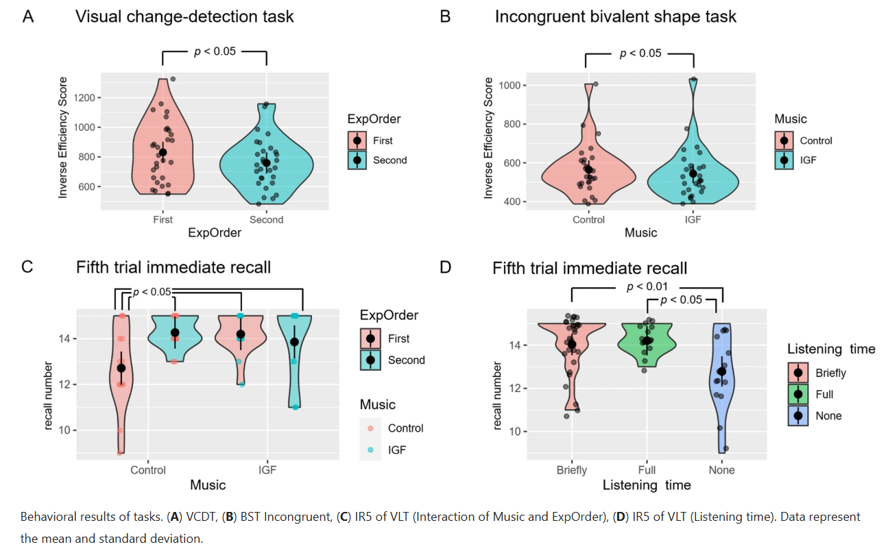 実際に個人毎に最も反応性の高い周波数であるIGFを刺激する条件・刺激しない条件で比較をしたところ、IGF刺激群では言語記憶課題及び実行機能課題の成績が有意に向上しました。言語記憶課題では、より長時間IGF刺激音楽を聴取した条件でより高い効果が確認されました。(以下図内D)