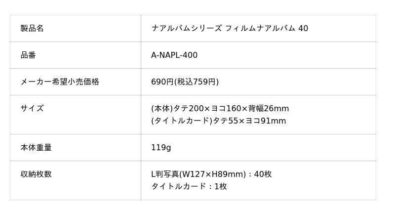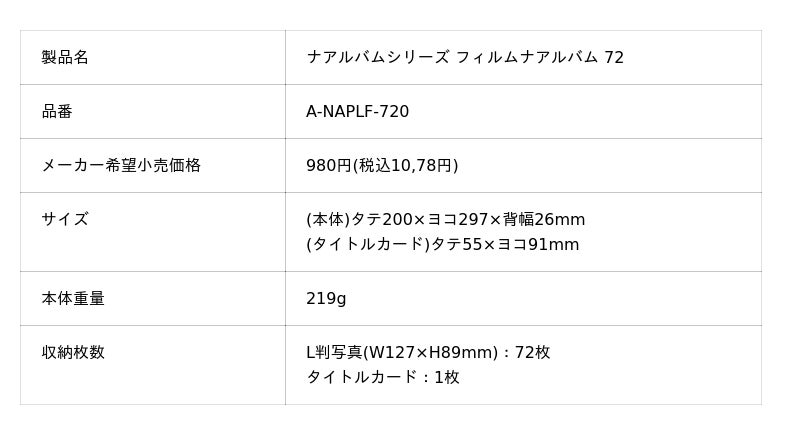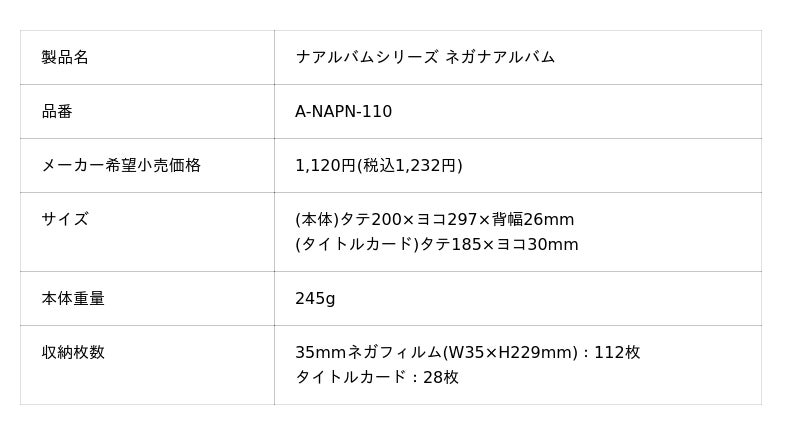 全てのシリーズに、撮影日、撮影に使用したネガフィルムの詳細、メモができるタイトルカードがセットになっています。ネガナアルバムには各ページにタイトルカードが付属しているため、データがわかりにくいネガフィルムの整理に便利です。[画像5: https://prcdn.freetls.fastly.net/release_image/98606/205/98606-205-7dbb6b7778a9c4e1ea306bad7916a8d8-1920x1280.png?width=536&quality=85%2C75&format=jpeg&auto=webp&fit=bounds&bg-color=fff ]