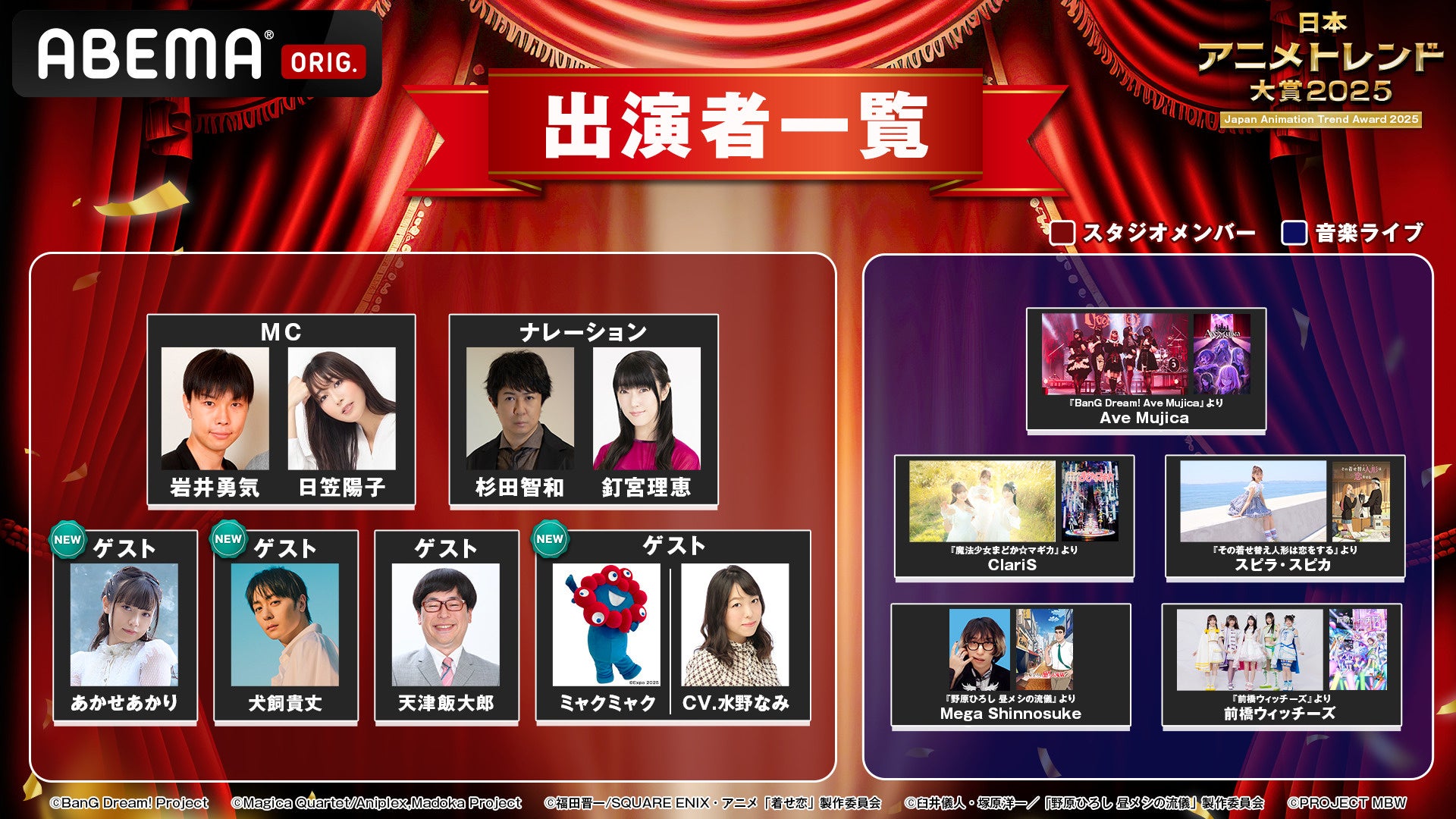 このたび、再現度の高さで話題を呼び、コスプレイヤーとしてのみならず俳優・アーティスト・TikTokerとマルチに活躍するあかせあかり、芸能界屈指のアニメ好きとして知られる俳優の犬飼貴丈、そして今年大きな話題となった大阪・関西万博の公式キャラクター「ミャクミャク」と、「ミャクミャク」のCVを務める水野なみのゲスト出演が決定いたしました。今回の出演にあたり、あかせは「来年のトレンドを先取り出来る事も含め、アニメ好きの人もライトに楽しみにしている人も、楽しめる番組かなと思います」、犬飼は「大好きな岩井さんとアニメの特集に関われて光栄です。個性豊かな作品にどんな発見があるのか、今からワクワクしています」、水野は「ミャクミャクを通して活動をする中で、『声』に関心を寄せてくださる方々も増えてきました。『日本アニメトレンド大賞』では今年注目の作品に携わった方々の声を沢山聞けることが素敵だと感じております」とコメント。『日本アニメトレンド大賞2025』を盛り上げる豪華メンバーが集結しました。