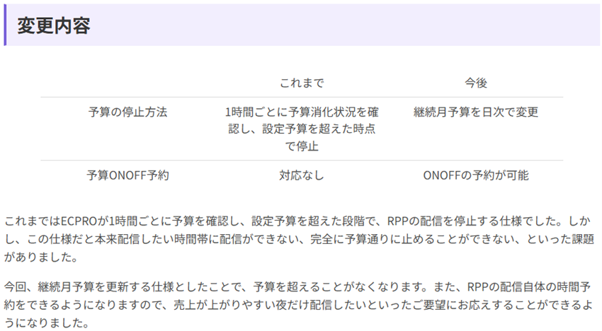 ECPROの継続月予算を日次で積み増せるようになり、予算超過なくRPP配信を管理できるようになりました。さらに、配信のON/OFFを時間指定で予約できるため、停止の遅れによる広告費のブレを抑えつつ、成果の出やすい時間帯に絞った配信が可能に。無駄配信の削減と機会損失の低減につながります。