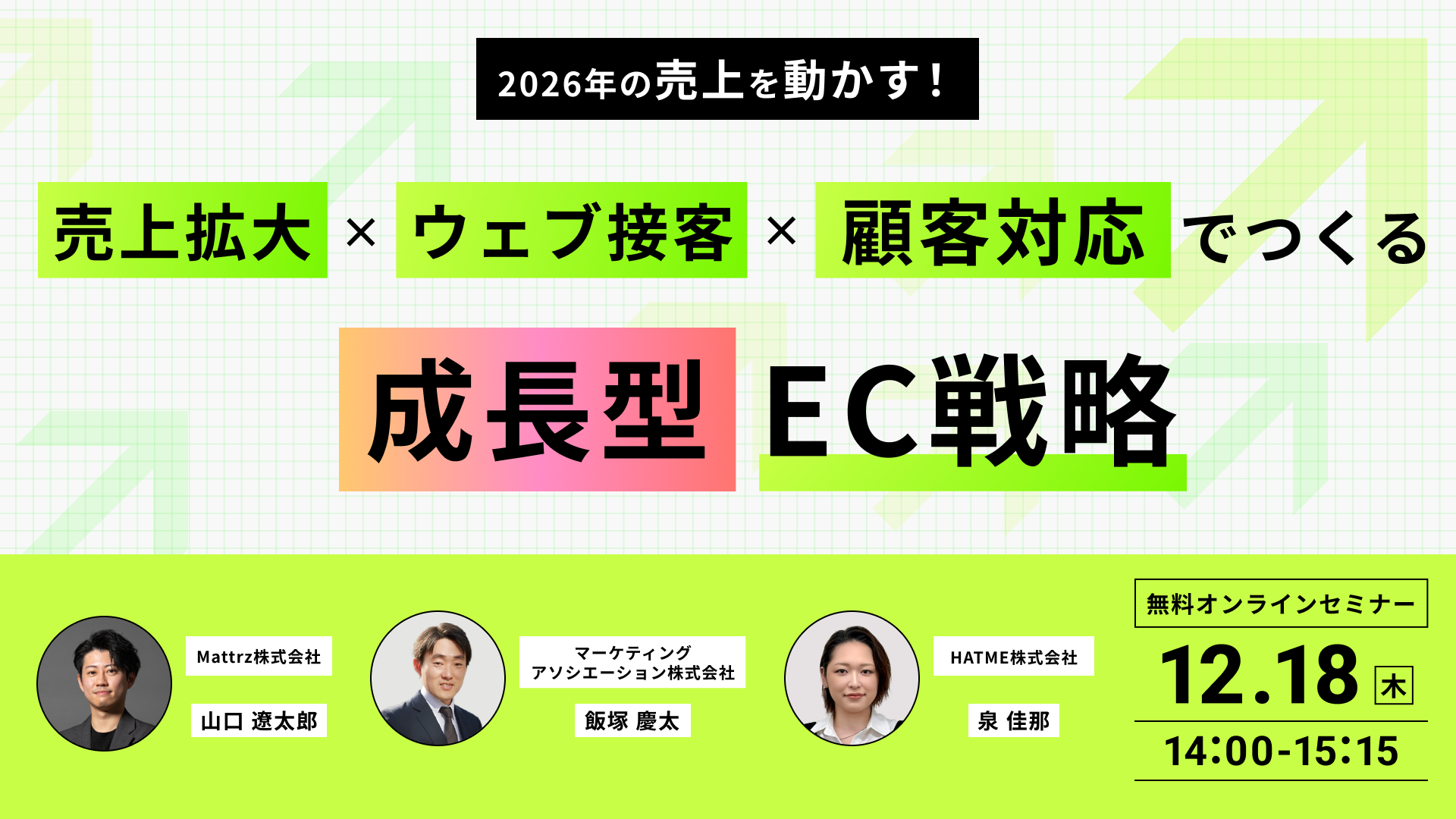 マーケティングアソシエーション株式会社の子会社であるHATME株式会社(本社:東京都台東区 代表取締役:中園広和、以下当社)は2025年12月18日(木)に、Mattrz株式会社、マーケティングアソシエーション株式会と、3社共催ウェブセミナー「2026年の売上を動かす!売上拡大×ウェブ接客×顧客対応でつくる成長型EC戦略」を、開催いたします。