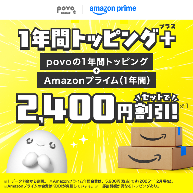 KDDI、沖縄セルラーは2025年12月4日から、povo2.0の「いつものトッピング」として、「360GB(365日間)」「120GB(365日間)」「60GB(365日間)」の1年間トッピング3種について、「Amazonプライム(1年間)」がセットで2,400円おトクなトッピングを新たに提供します。