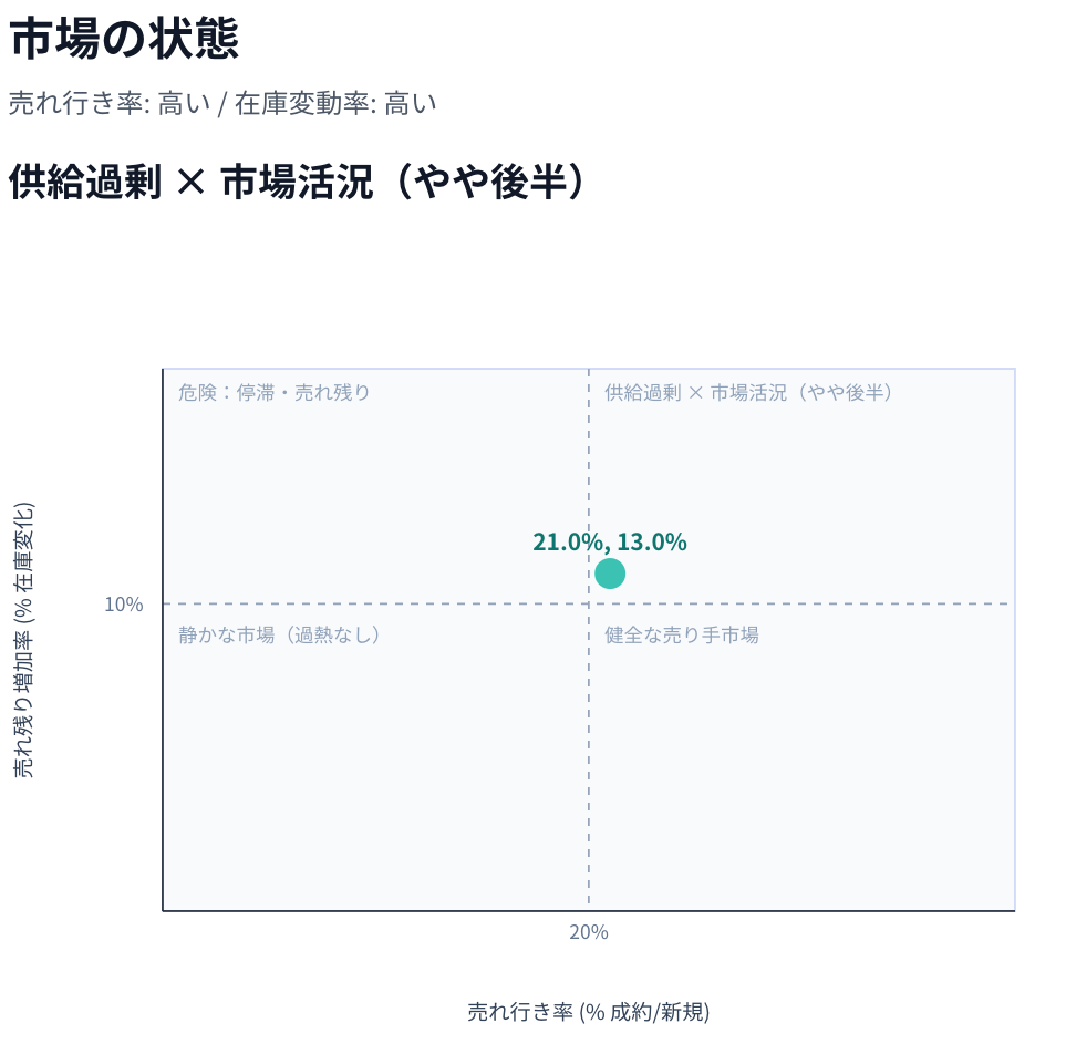 過去の物件の成約・新規・在庫の推移から、売れ行き(吸収率)、在庫変化率、市場の活発度を可視化。市場が“過熱気味”なのか“静かな状態”なのかを把握できます。