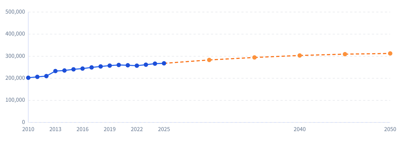 東京都港区における過去の人口推移と、予測される推移。緩やかに上昇していくことが想定されるため、安定した実需が期待できる。