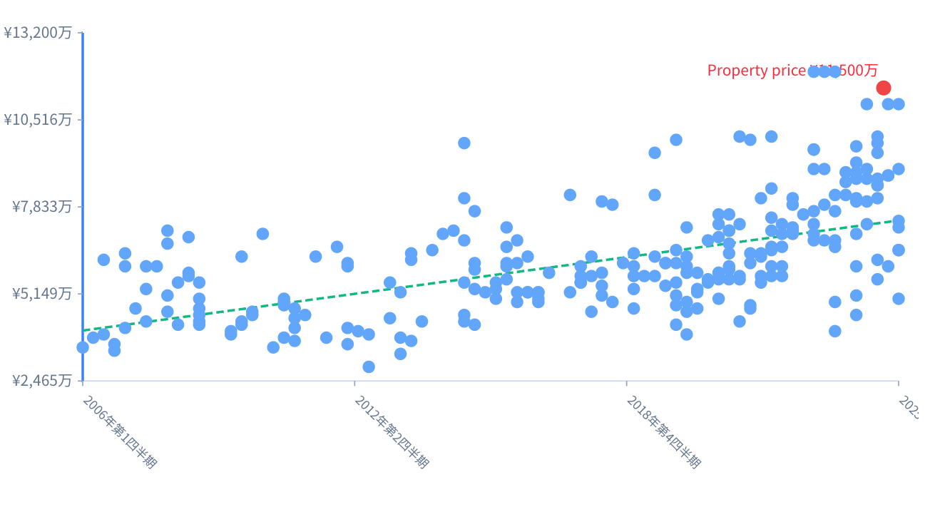 同区域で類似の平米物件の過去の取引履歴。実際に取引された相場自体が、緩やかに上がっていることが分かるだけでなく、本物件が現在の相場としても高めであることが見てとれる。