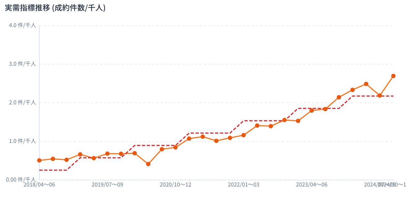 バブル指標 (実需指標推移) が上がっている例。2018年から2025年までで、対象地区の人数に対して、物件の取引件数が高く上昇しており、投機での売買が多くなっていることが示唆される。