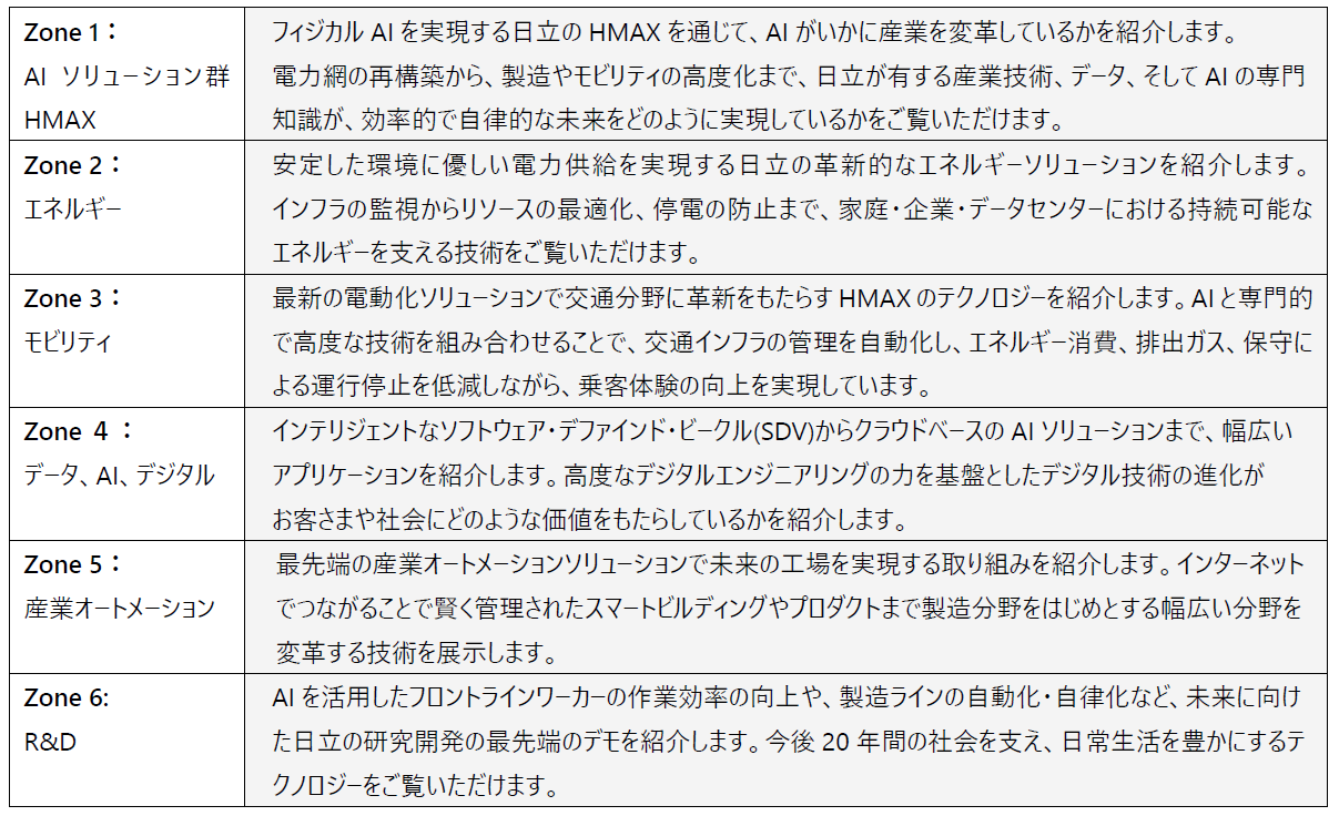 日立のブースでは、モビリティ、エネルギー、イノベーション、産業の未来を垣間見せる6つのZoneを通じてソリューションを紹介します。展示には、日立のフィジカルAIを象徴するソリューションであるHMAXも含まれます。