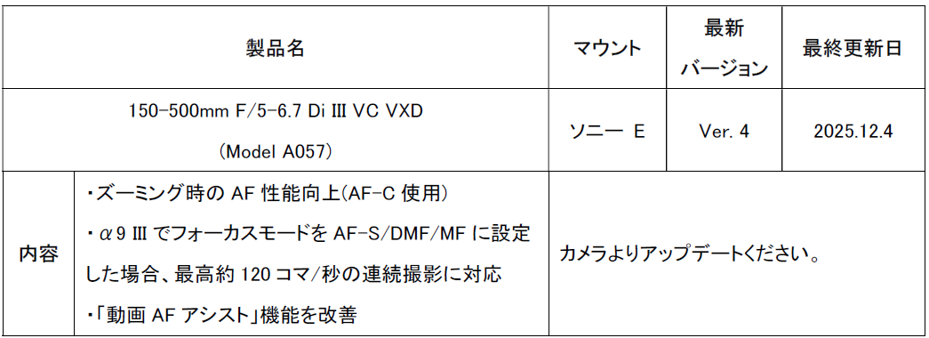 総合光学機器メーカーの株式会社タムロン(本社:さいたま市)は、タムロン「150-500mm F/5-6.7 Di III VC VXD (Model A057)」ソニー Eマウント用のレンズファームウェアアップデートについてご案内いたします。