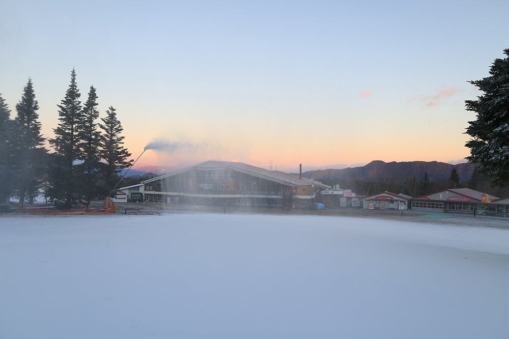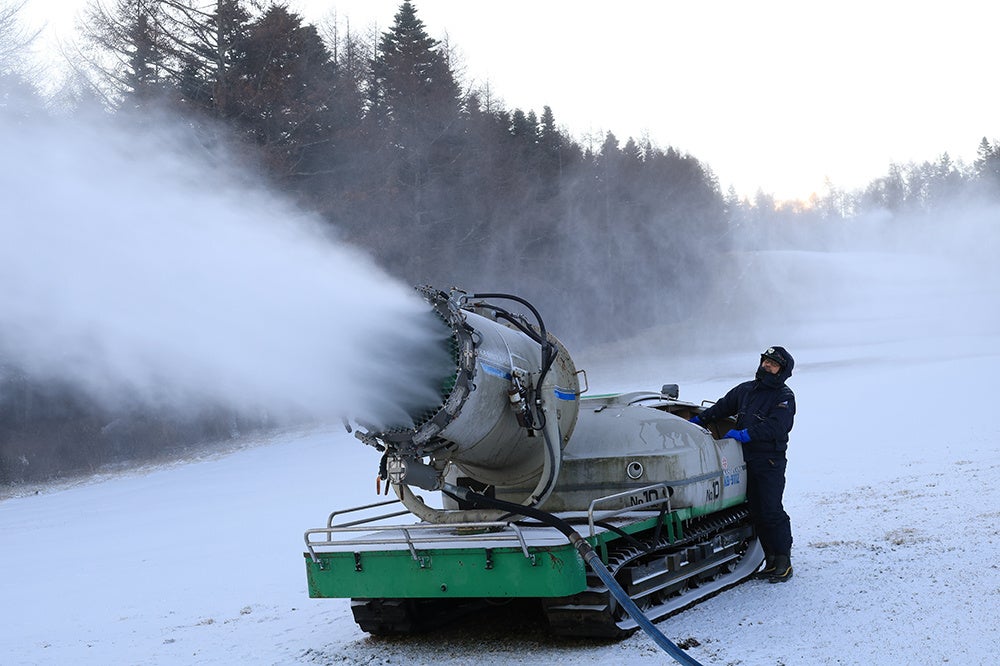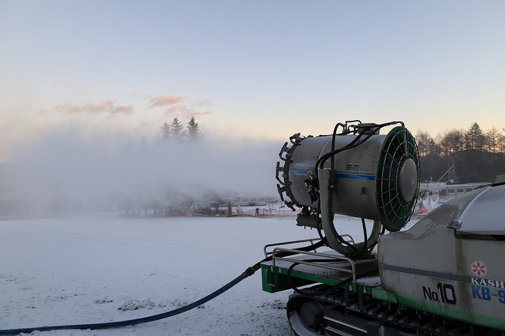 ふじてんスノーリゾートでは、スノーガン、スノーマシン、ローエアーガンの3種類の人工降雪機を使用し、雪を積もらせた後、圧雪車でゲレンデ作りを行います。