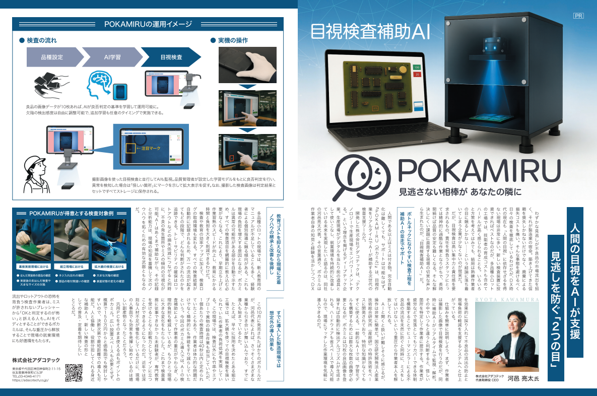 今回の掲載では、POKAMIRUの特長や活用イメージが分かりやすく紹介されており、製造現場における検査業務の課題解決にどのように寄与するのかを詳しく知っていただける内容となっています。