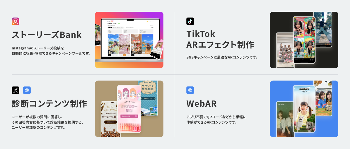 SNSキャンペーン、診断コンテンツ、ARエフェクトなどをワンパッケージでご提供します。