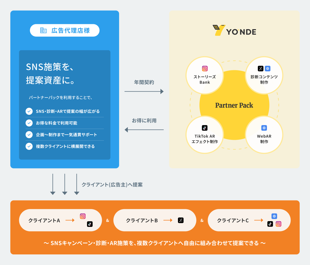 「YONDE パートナーパック」は、これまで多数の企業・ブランドに採用されてきたSNSキャンペーン、診断コンテンツ、AR制作の実績をもとに開発した新サービスです。
