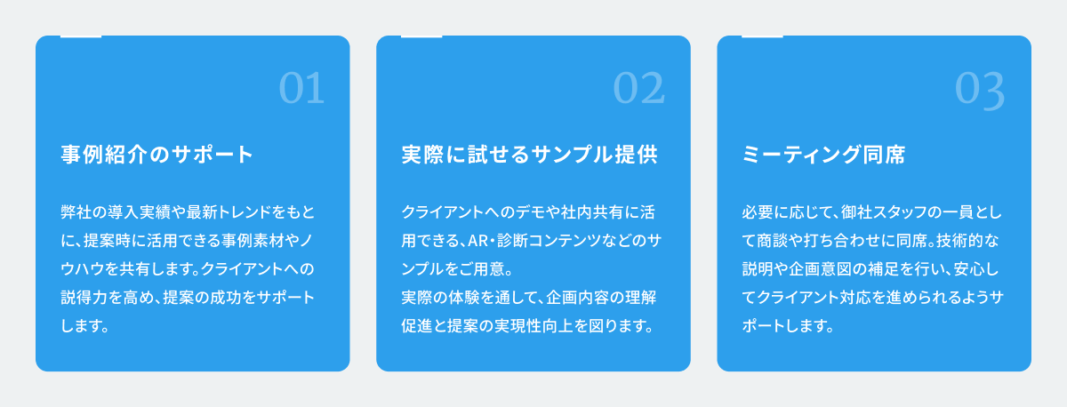 クライアントへのデモや社内共有に活用できる、AR・診断コンテンツなどのサンプルをご用意。 実際の体験を通して、企画内容の理解促進と提案の実現性向上を図ります。