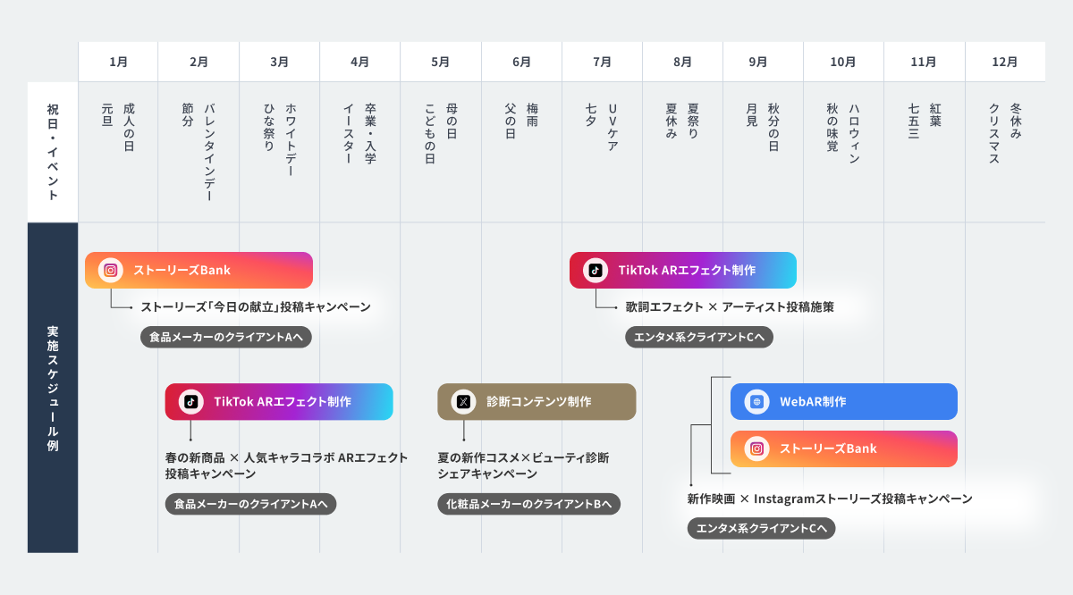 たとえば、食品メーカーのクライアントAには、「今日の献立」をテーマにしたストーリーズ投稿キャンペーンを実施しつつ、春の新商品に合わせて人気キャラクターとコラボしたARエフェクトキャンペーンを追加。