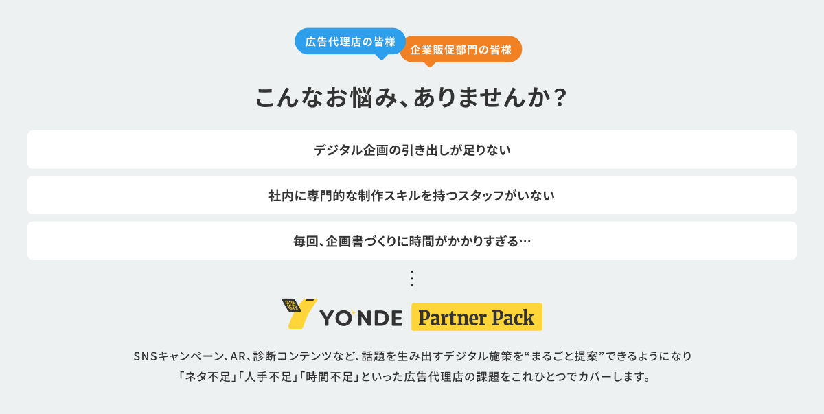 「YONDEパートナーパック」は、広告代理店の提案力を拡張する月額制のデジタル支援サービスです。
