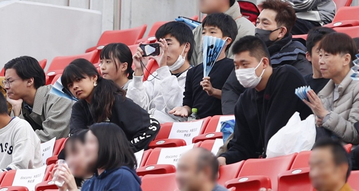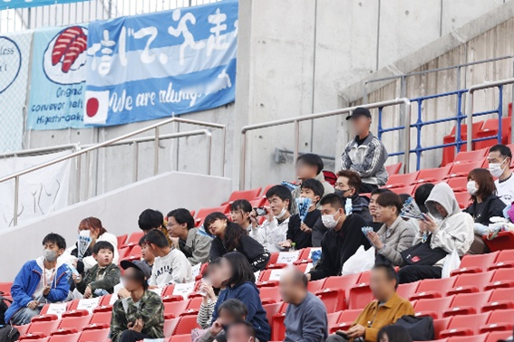 試合が始まるとサポーターがフラッグを振って応援する雰囲気に驚きつつ、声を張って精いっぱい応援し、観戦を楽しみました。