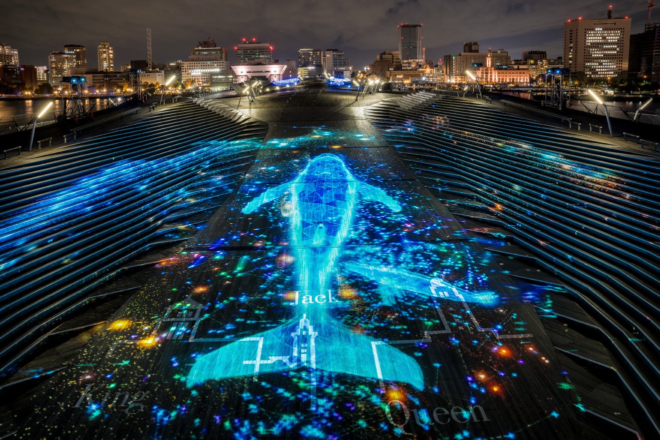 国内最大級の参加型屋外プロジェクションマッピングを中心に、屋上全体が特別な光で包まれる。大さん橋屋上全体が演出エリアになり、その中心には、25mの光のくじらが雄大に泳ぐ、国内最大級のプロジェクションマッピングが登場します。波打つようなウッドデッキ〈くじらのせなか〉で光に包まれる没入体験をお楽しみいただけます。