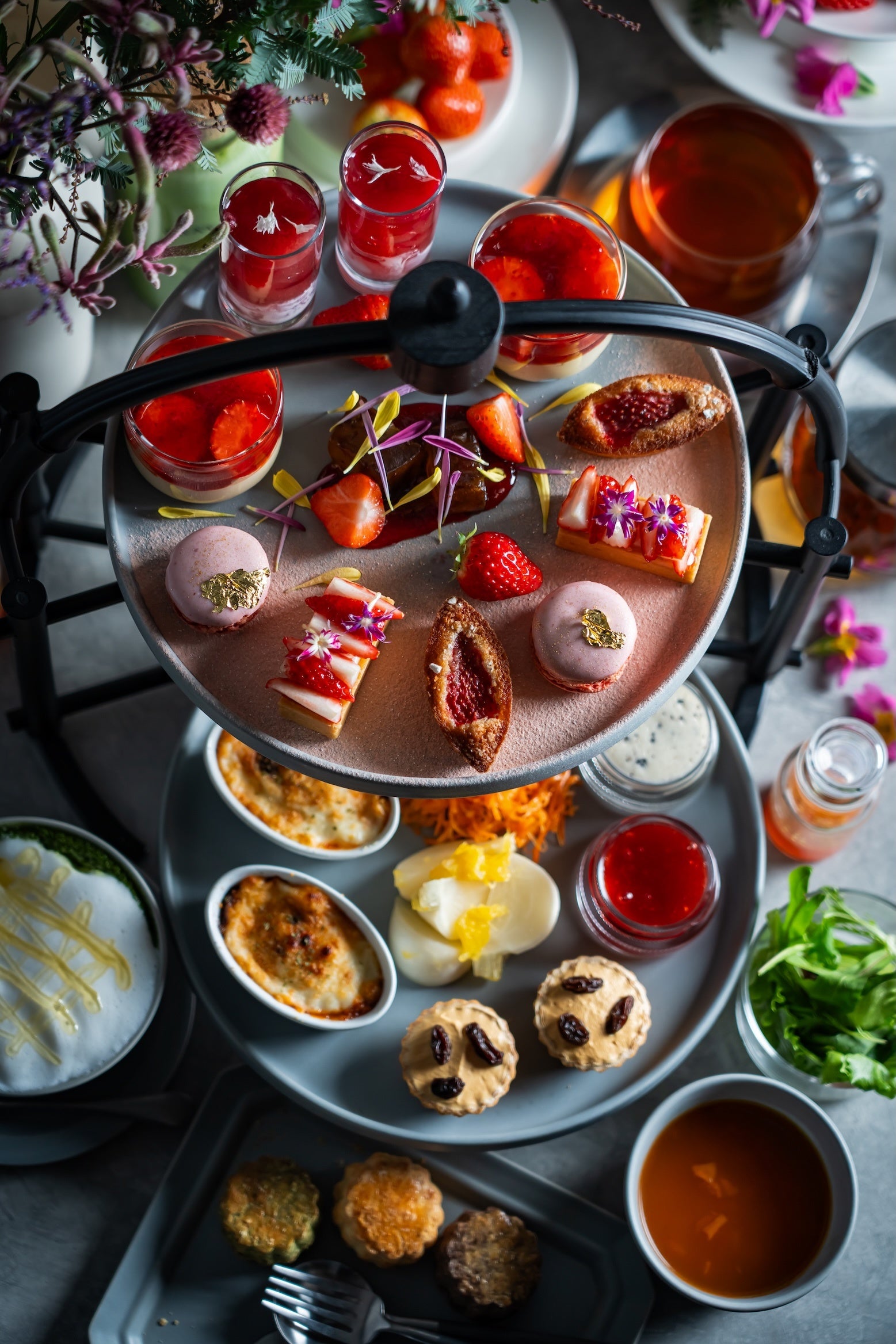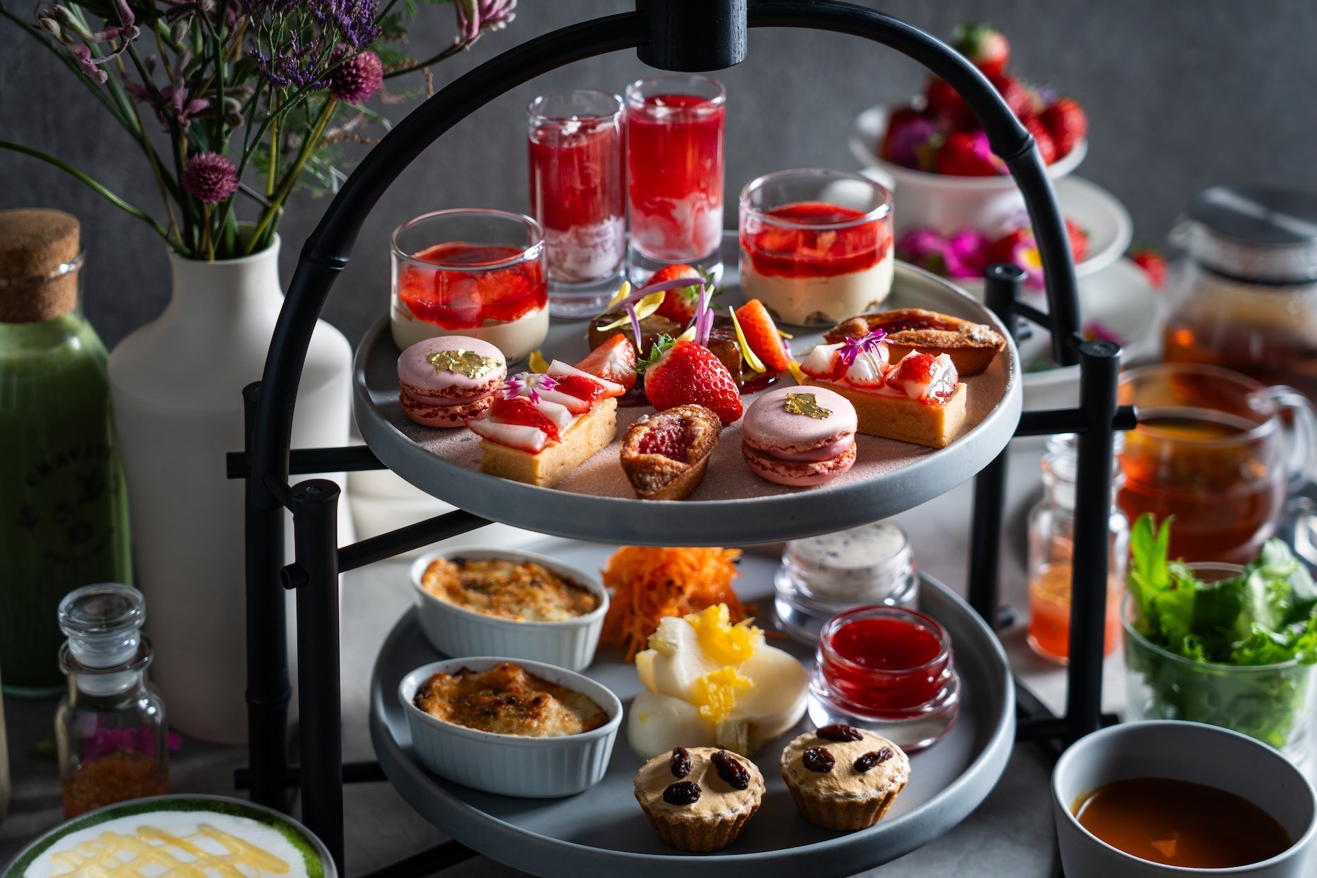セイボリーには、「蕪のオレンジマリネ」や「アールグレイのキャロットラペ」など、旬の味わいや香りが織りなすラインナップで、冬ならではの彩りを盛り込んでいます。「鶏レバーペーストのキャラメルレーズンタルト」は冬にぴったりな濃厚な味わいです。また、「自家製ベシャメルソースのベジミートグラタン」は熱々をお楽しみください。スープは「ミネストローネ」、サラダはグリーンハーブサラダにオリジナルの苺ドレッシングを添えてご用意しております。