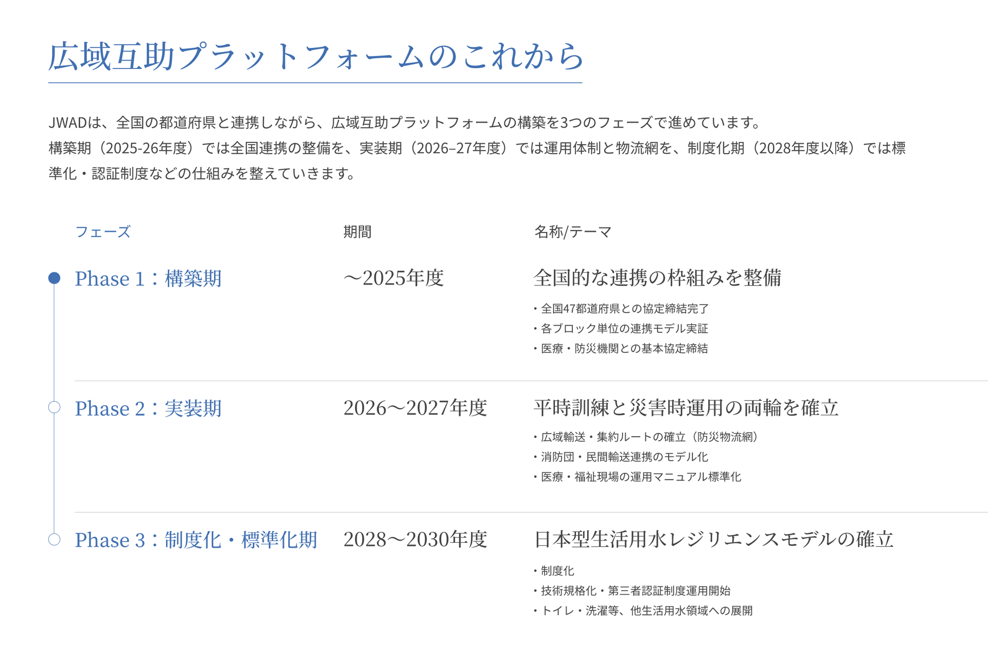 JWADは全国の都道府県と連携し、本プラットフォームの構築を3段階のフェーズで推進します。構築期(2025~26年)には全国的な連携の枠組みを整備し、実装期(2026~27年)には平時の訓練と、物流を含む災害時運用の体制を立ち上げます。そして制度化・標準化期(2028年以降)においては生活用水資機材の規格化や認証制度を開始し、人々の衛生と尊厳を守る日本発の生活用水レジリエンスモデルを確立します。