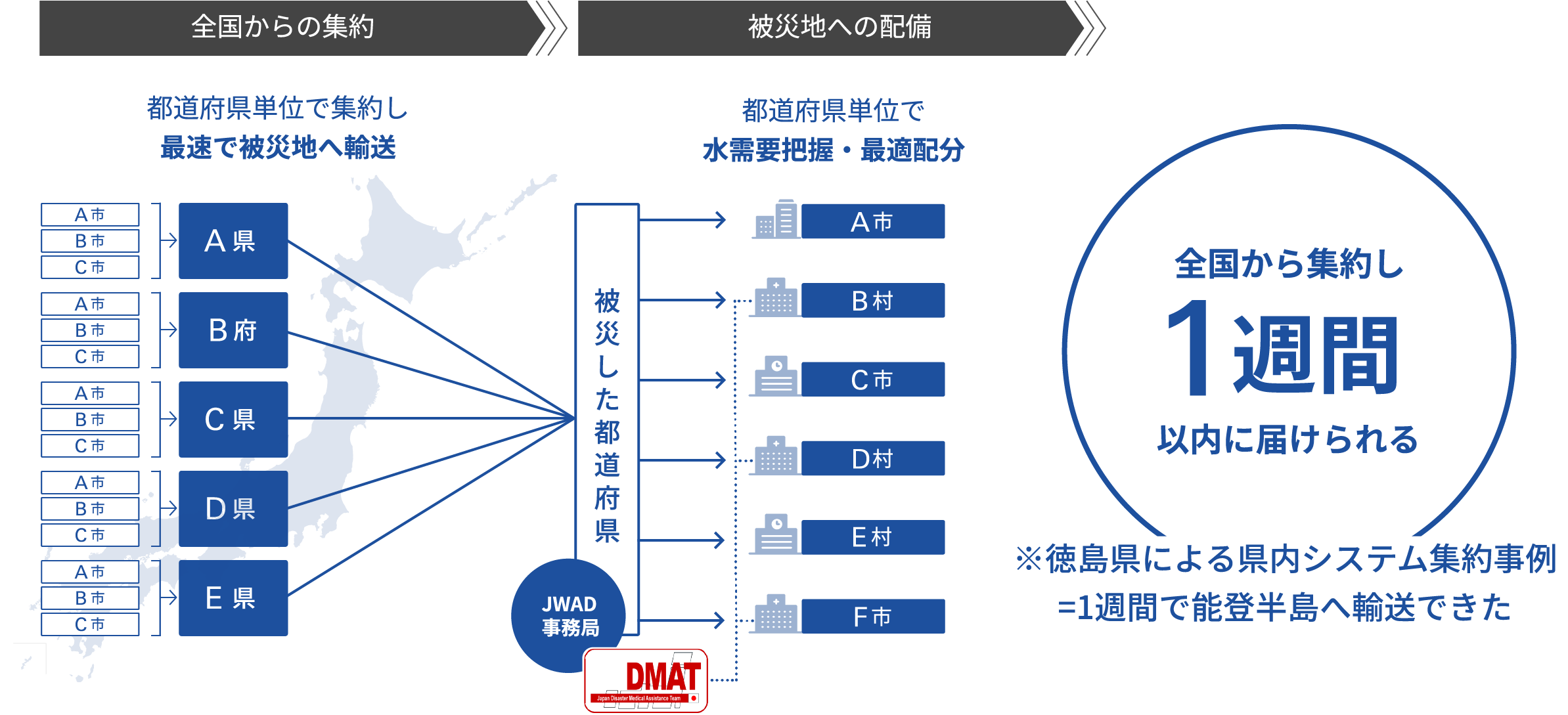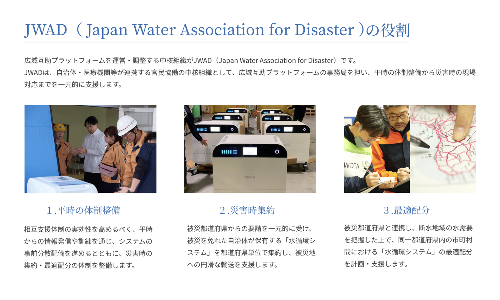 - - WOTAは、生活用水資機材(「WOTA BOX」「WOSH」等)を活用した広域互助プラットフォーム「JWAD」を組織・運営し、被災自治体(受援団体)からの要請受付、被災していない自治体(応援団体)との調整、資機材の割り振り、および平時の事前配備調整を行う