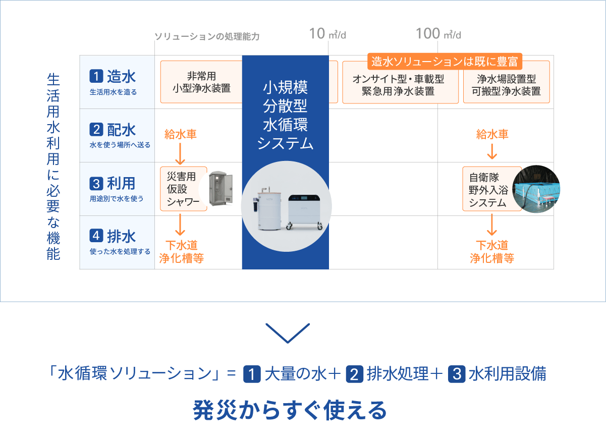 災害時の生活用水確保のため、現在多くの自治体が可搬型浄水装置(非常時に河川水や防火用水等を処理して安全な水をつくる装置の総称)の配備を検討・推進しています。しかし、こうした造水ソリューションのみでの問題解決は現実的ではありません。実際の災害現場においては、つくった水をどのようにして需要地に届け、どのような設備で使用し、使った後の排水をどのように処分するかということが大きな課題となるからです。