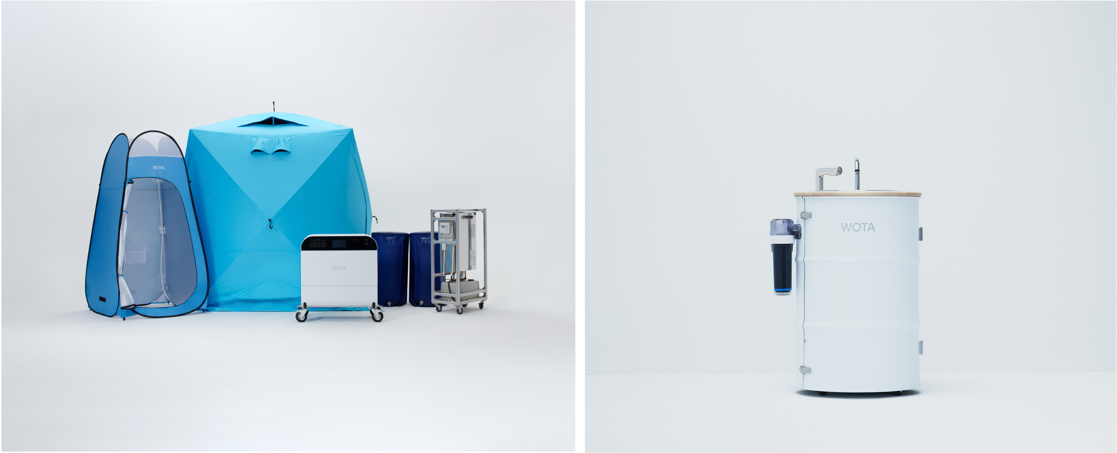 写真左:水循環型シャワー「WOTA BOX」/写真右:水循環型手洗いスタンド「WOSH」