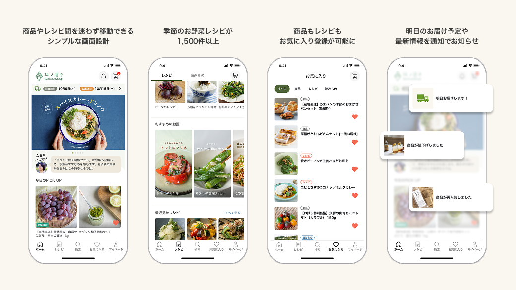 これまでもオンラインショップで発信していた、季節の移ろいを感じるコラムや旬の野菜を使ったレシピ、生産者のストーリーなどのコンテンツと、お買い物の機能とを、アプリでは自然に行き来しやすく、「読む」「知る」「買う」をひとつの流れとして体験できるよう設計しました。また、届いた野菜への感想を農家さんへ届けられるフィードバック機能や、定期宅配のお客さま向けの、野菜セットを通じてどれほど温室効果ガスの排出を抑えられたかをマイページで確認できる機能などにも、アプリではよりアクセスしやすくなっています。