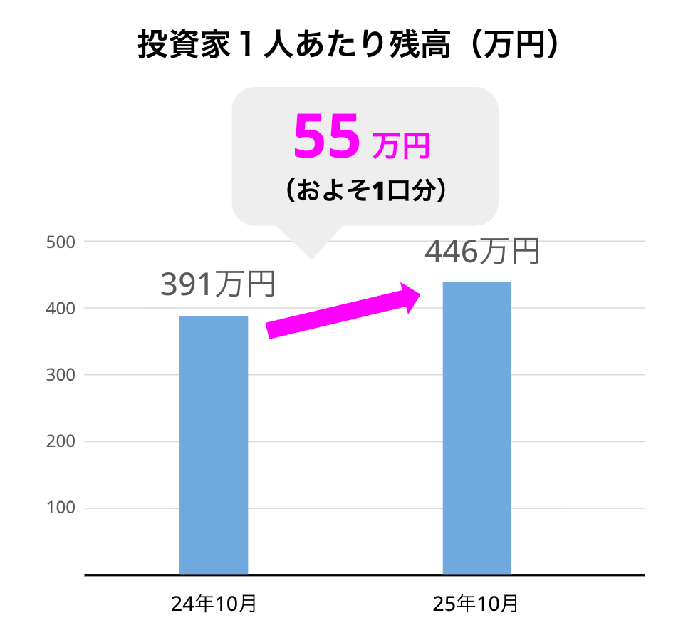 おまとめ債発売前後の新規口座開設者で比較すると、1人あたりの残高平均は55万円の増額、およそ社債1口(50万円)分増加しました。