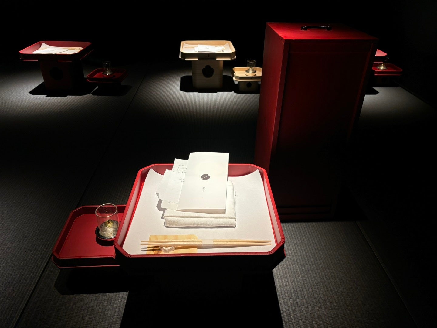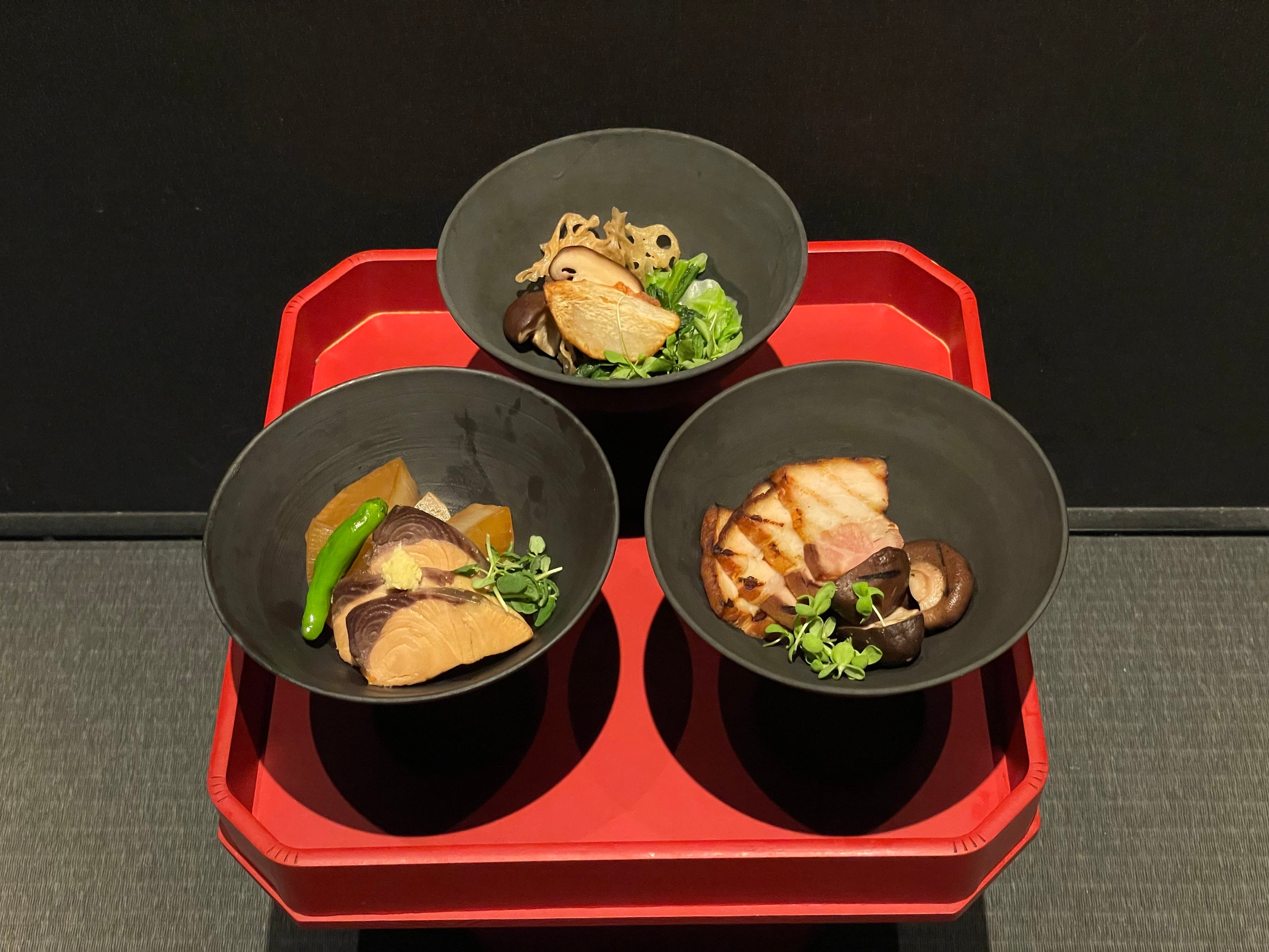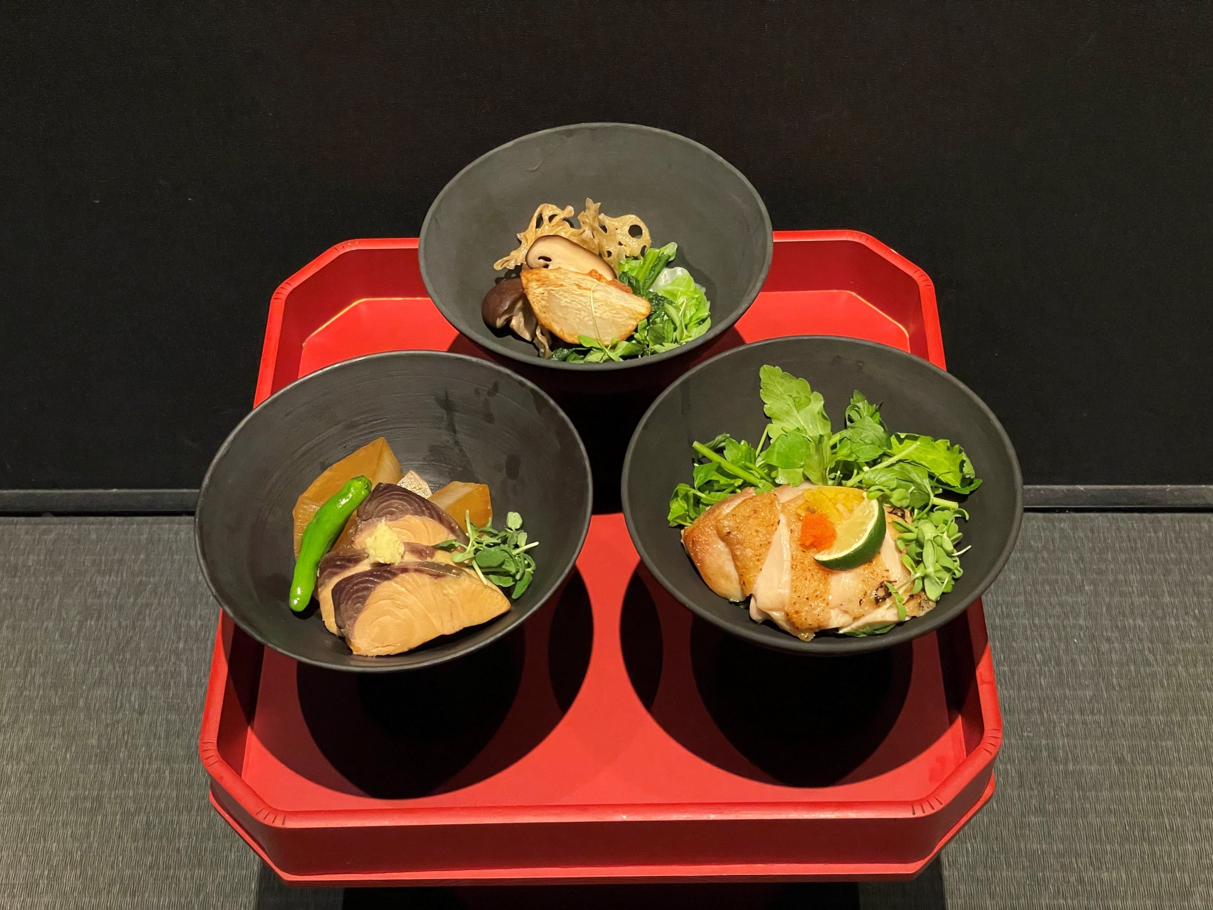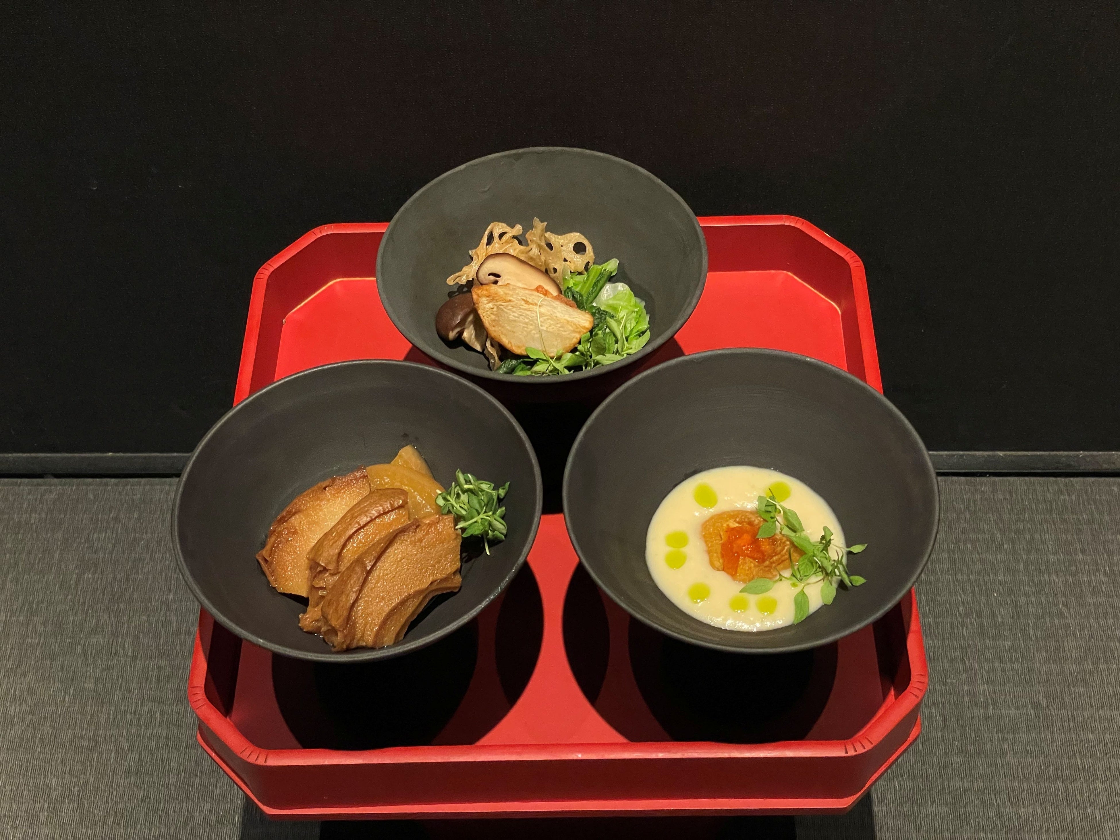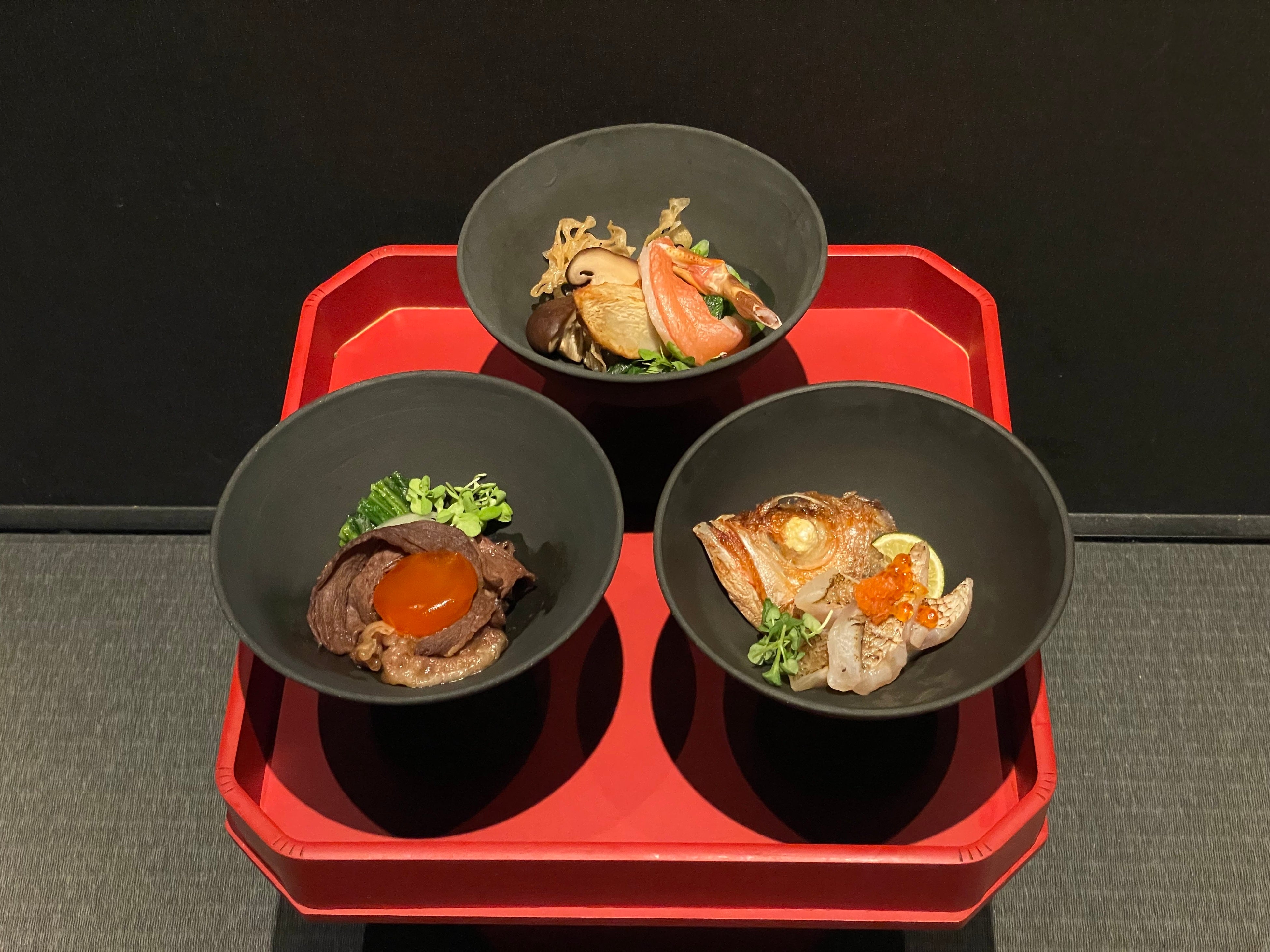 ■メニュー barrierでは、三方(さんぼう)をお膳として利用し、岡持ち(おかもち)に収められた三つのお椀料理に、サイフォンで抽出された一番出汁を注ぎます。 これにより、一杯のお出汁がお客様の食体験に奥深さと芳醇さを加えます。 barrierは、伝統的な日本料理のエッセンスを守りつつも、現代的なアプローチで新たな魅力を引き出すことを目指しています。 漆黒の空間で五感を研ぎ澄ませて、出汁に合う料理をお楽しみください。