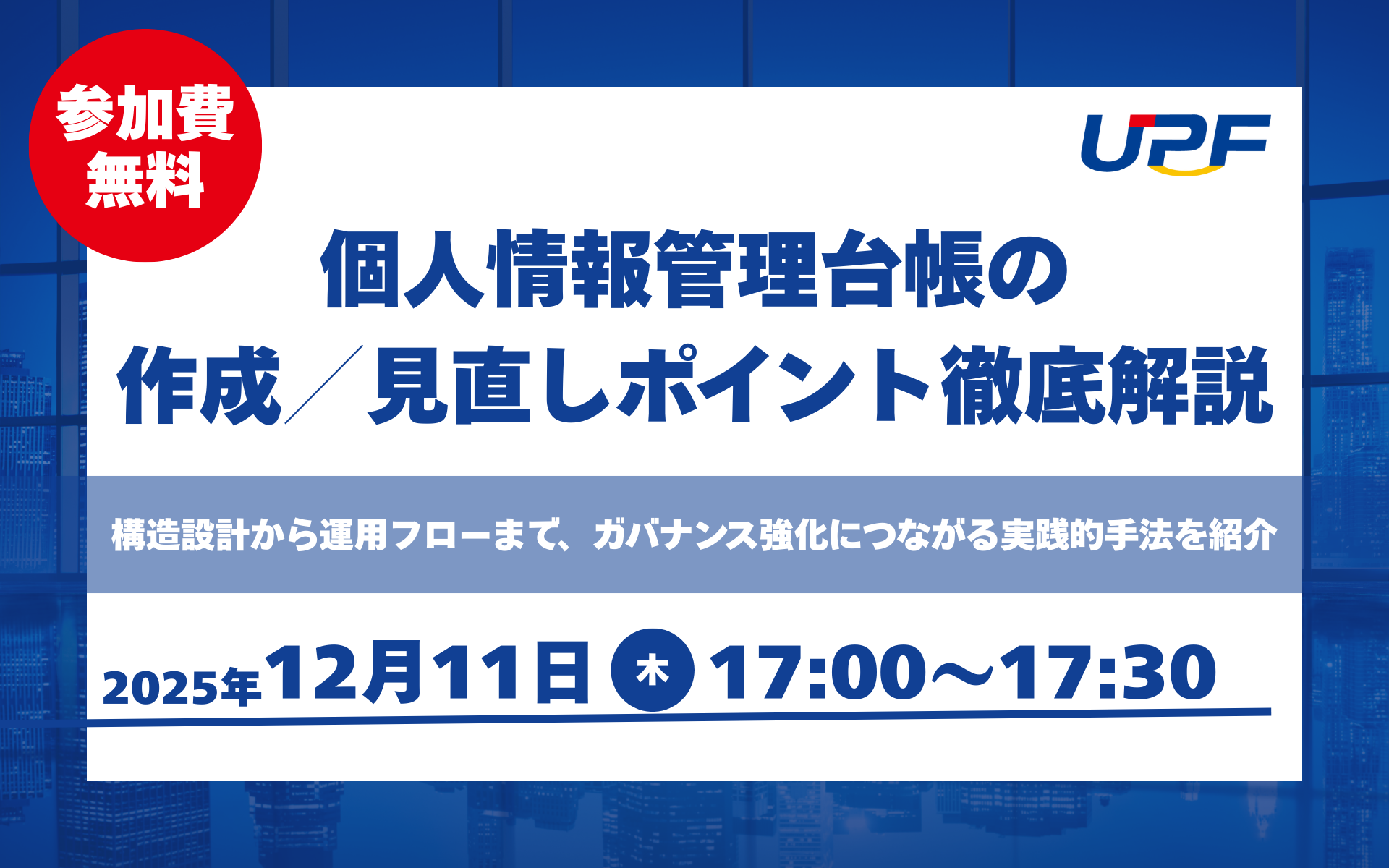 リスクマネジメント分野のコンサルティングサービスを提供する株式会社UPF(本社:東京都中央区、代表取締役:仲手川 啓、以下当社)は、2025年12月11日(木)17:00より、個人情報管理台帳の作成から運用までを体系的に学べる無料オンラインセミナーを開催いたします。