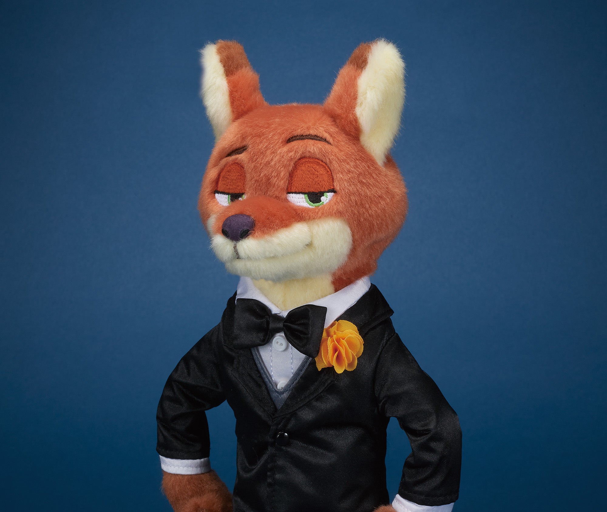 本商品では、ディズニー新作映画『ズートピア2』内のワンシーンに登場する印象的なタキシード姿の「ニック・ワイルド」を、上質な素材と仕立てで再現しました。「ニック・ワイルド」の魅力が際立つよう、全体をシャープで洗練された印象に仕上げています。クオリティにこだわり抜いた本商品は、作品に思い入れのあるファンの方々にもきっとお楽しみいただける自信作です。