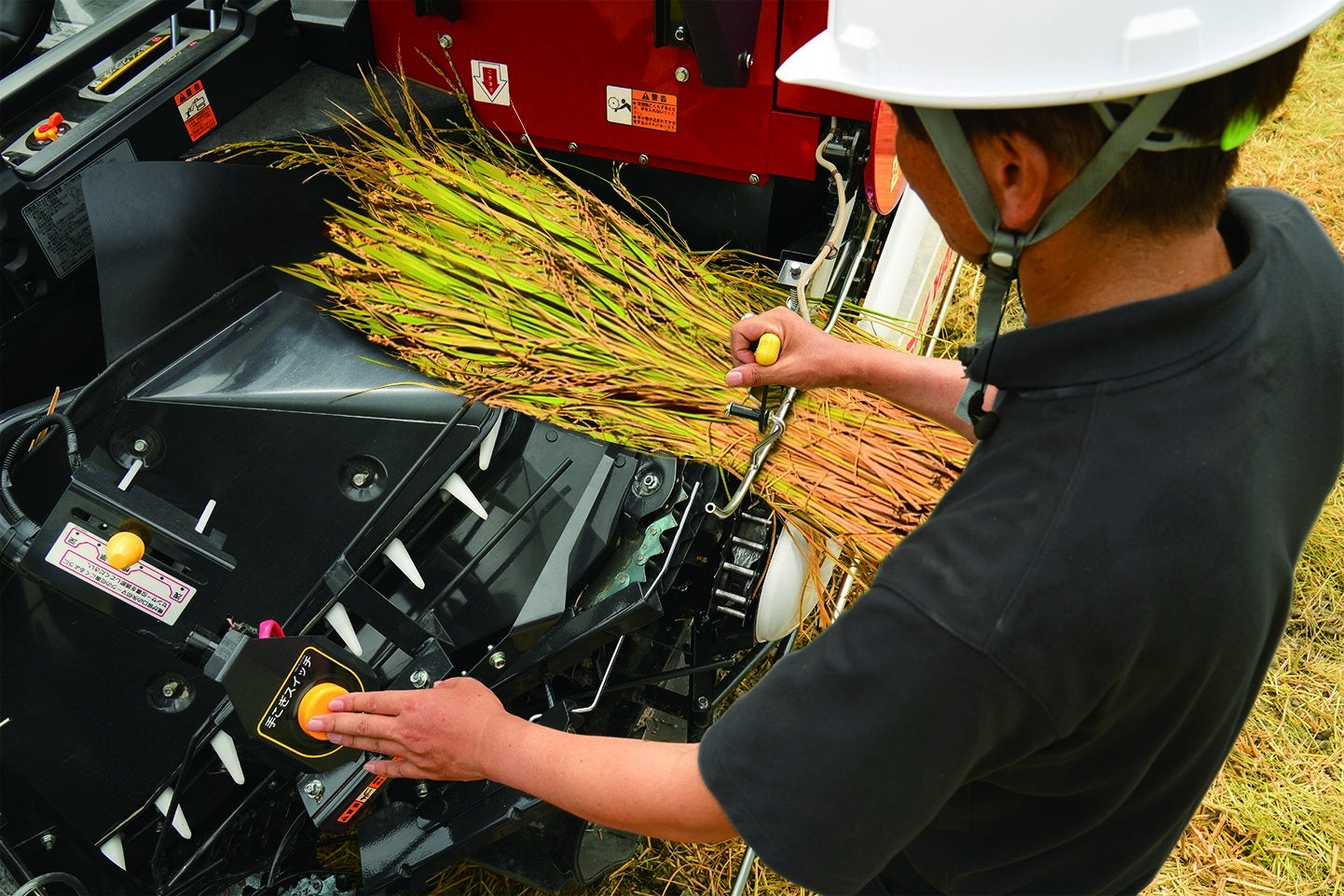 本機では、フィードチェーンへの巻き込まれ事故を防ぐ「手こぎ安全装置」を搭載し、安全性が向上しました。また、小型機ながら籾の排出作業を効率化するオーガシュータを搭載することで作業性が大幅に向上しました