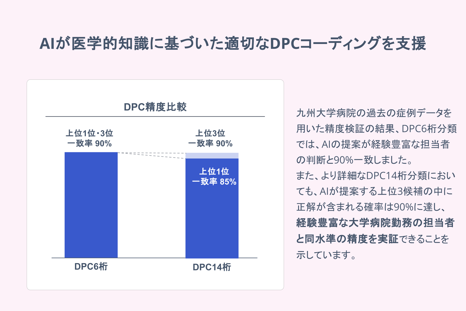 本取り組みでは、九州大学病院の過去の症例データを用いた精度検証を実施しました。経験豊富なコーディング担当者が選定したコードとAIの提案コードの一致率は90%を達成し、残り10%についても、人の目で見直した上でコード変更が妥当であることを確認しました。