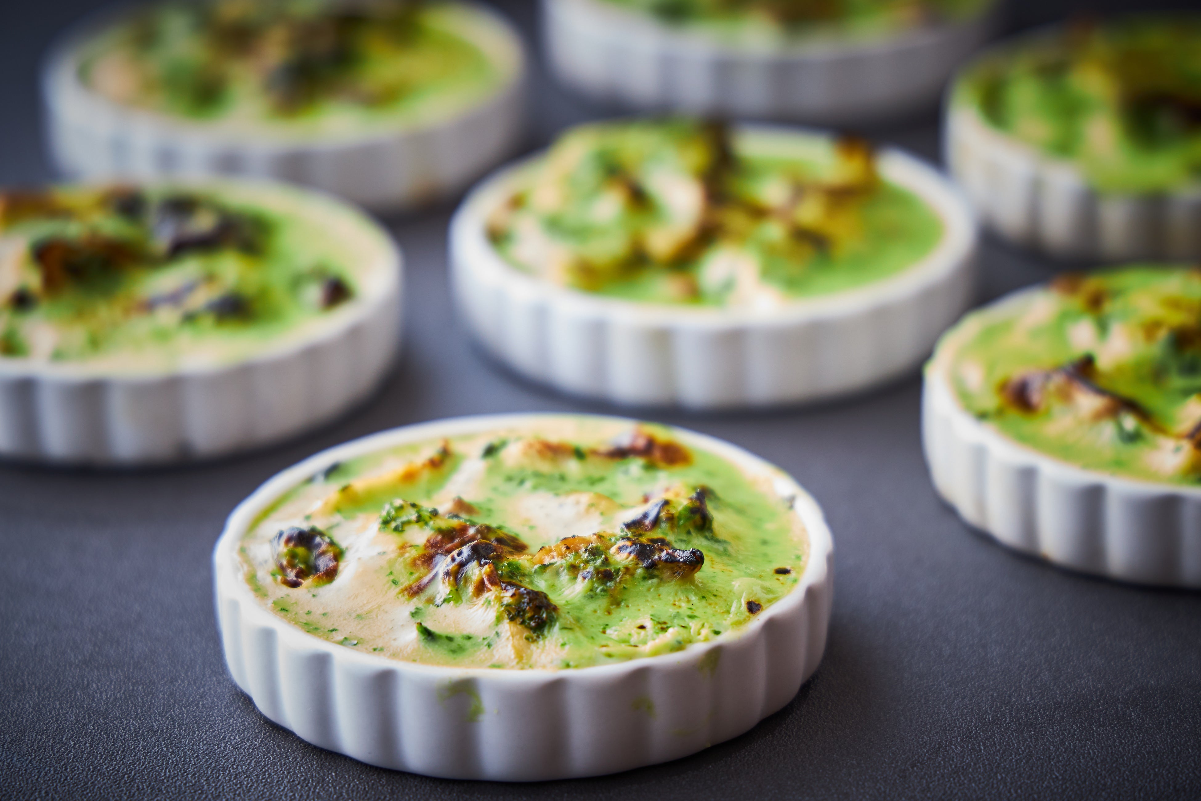 富山県産バイ貝と甘海老のブルギニョン バケット添え<ランチタイム>コリコリした歯ごたえの“バイ貝”と濃厚で上品な甘みの“甘海老”に、ガーリック風味のブルギニヨンバターで焼き上げました。魚介の味わいとガーリックやハーブ、バターのコクが相性抜群な一品を、ぜひ熱々の状態でお召し上がりください。