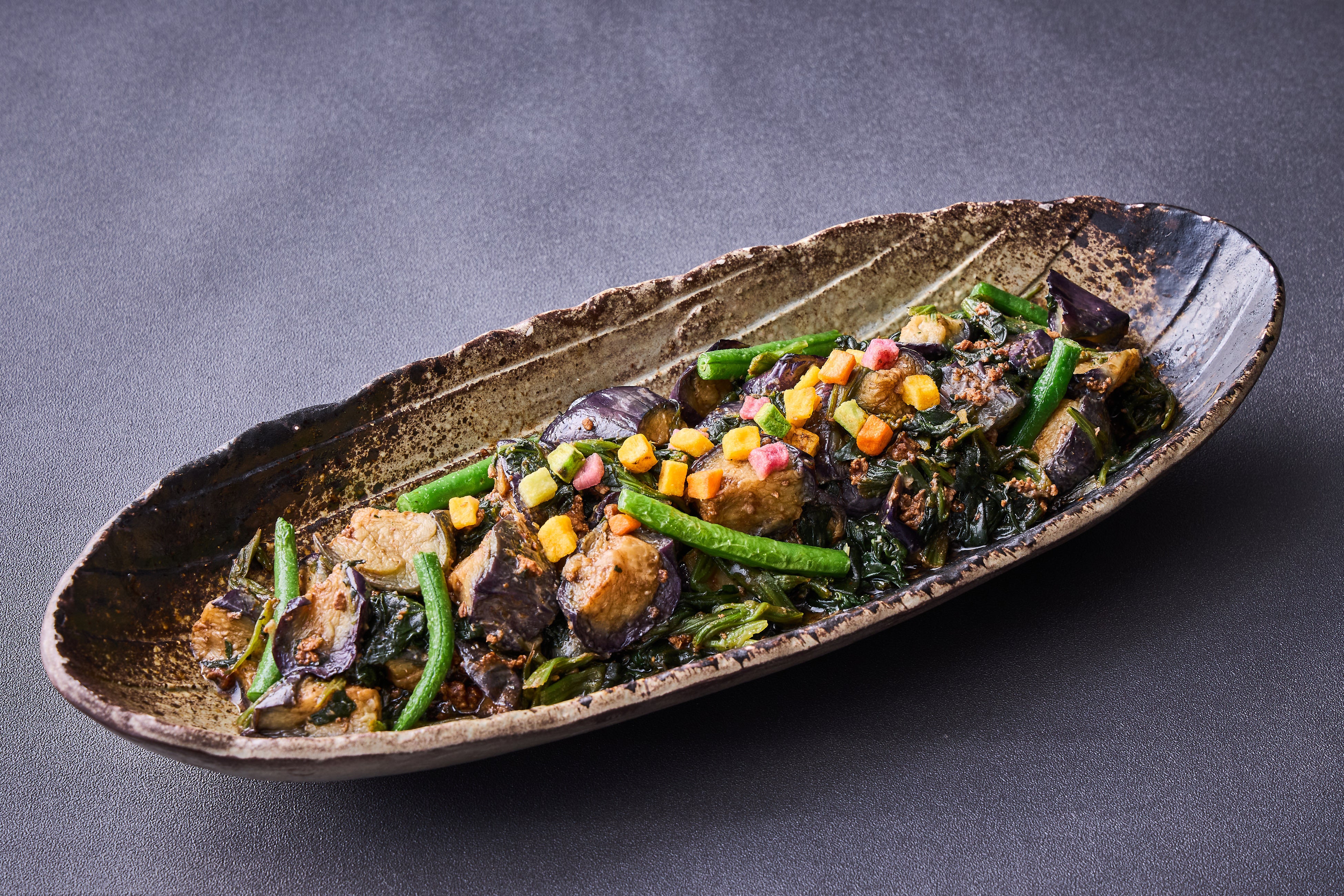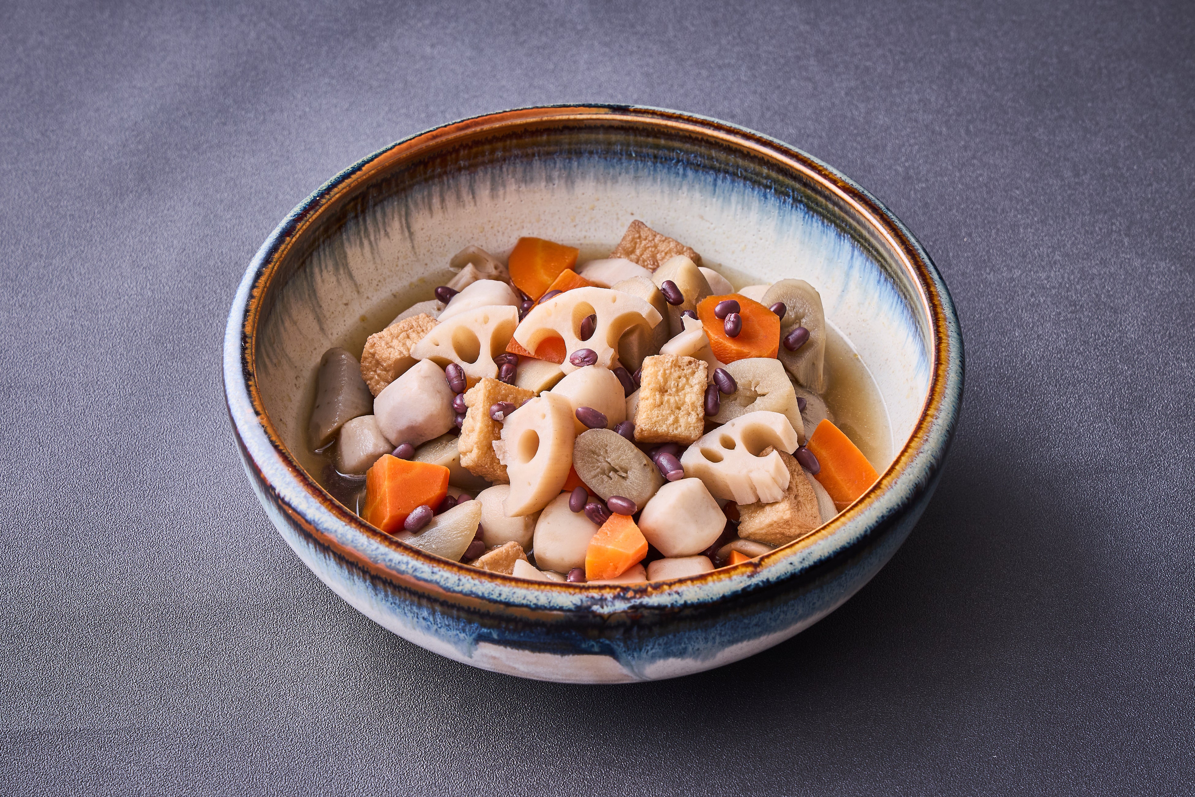 富山県の郷土料理からは、「根菜のいとこ煮」と「よごし」をご用意。「いとこ煮」は、小豆と根菜などの野菜を一緒に煮込んだ、素朴ながらも滋味深い一品。冬場の栄養補給にもぴったりで、今もなお地元の人々に愛されている一品をご堪能ください。「よごし」は、茹でた野菜を味噌と和えて炒めた料理です。夜に作り置きをして翌朝に食べることから「夜越し」と呼ばれ、肉味噌の甘辛い味がやみつきになる美味しさです。