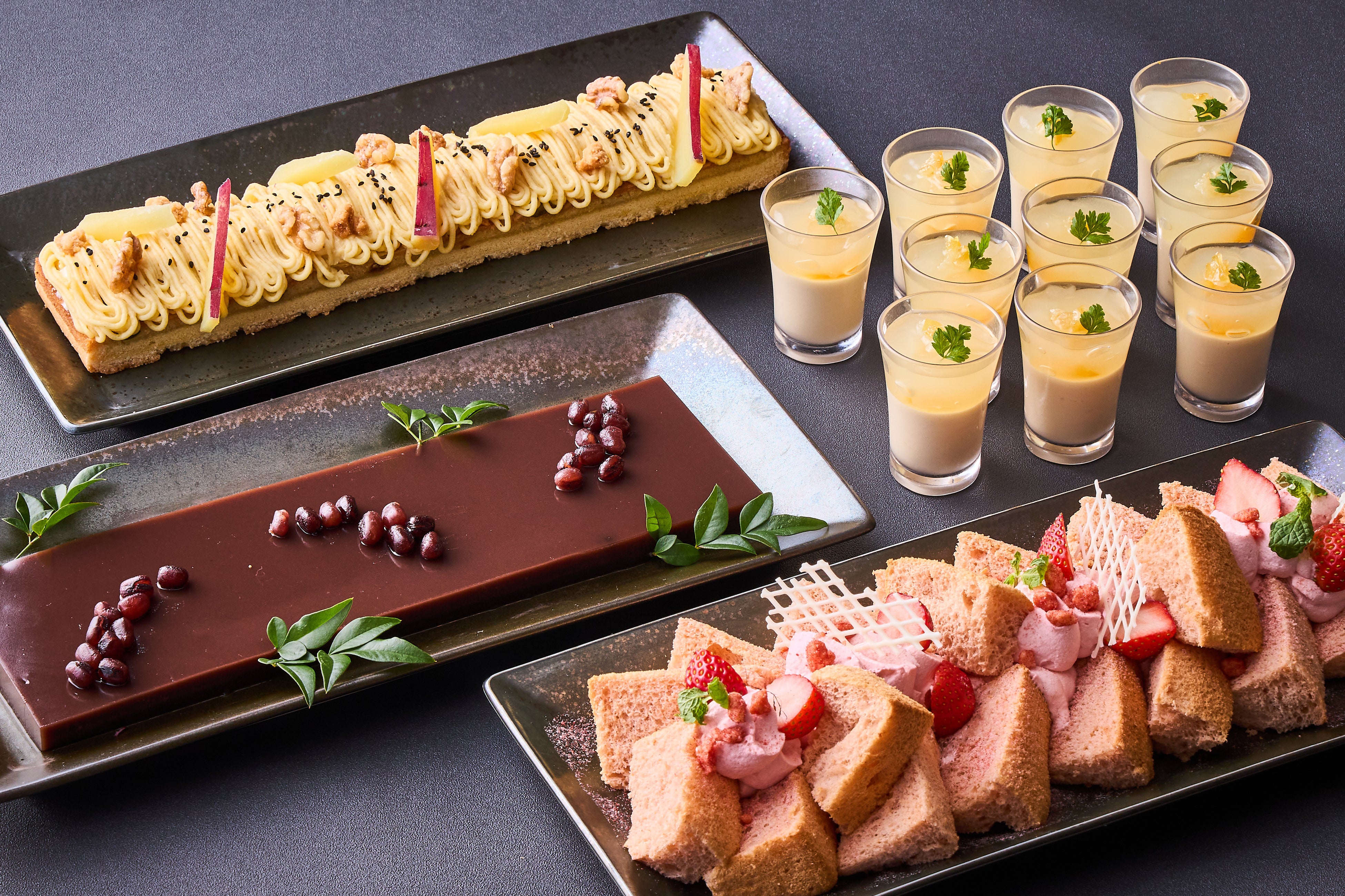 スイーツでは、石川県加賀地方で生まれた独特の芳ばしい香りをまとった「加賀棒ほうじ茶と柚子のヴェリーヌ」をお楽しみください。ブランマンジェと柚子ゼリーの相性が抜群です。また、福井県の雪が降る冬にこたつで「水ようかん」を食べる風習にちなみ、なめらかな口当たりに、黒糖のやさしい香りと上品な甘さを加えたパティシエ特製バージョンをご用意いたしました。ランチ限定スイーツには、きめ細かく、しっとり・ふわふわ食感の「富山県産米粉の苺シフォンケーキ」を、ディナー限定では、とろける甘さが特長の福井県産さつまいも“とみつ金時”のモンブランなどをご堪能ください。