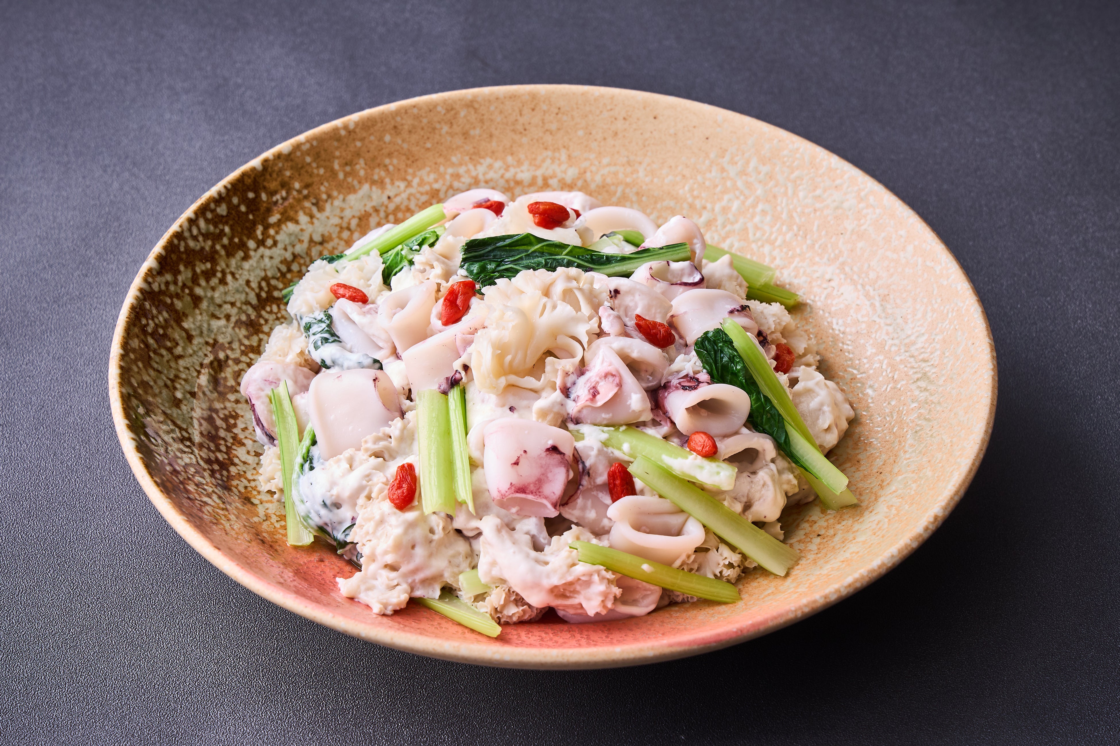 中国料理からは、コリコリとした食感とクセのない上品な味わいが特徴の北陸産「花びら茸」を使用した一品をご用意いたします。炒めることで、花びら茸のやさしい甘さと旨みを引き出し、ほどよい歯ごたえのいかをミルクのまろやかなコクで合わせたヘルシーな一皿を、ぜひご堪能ください。