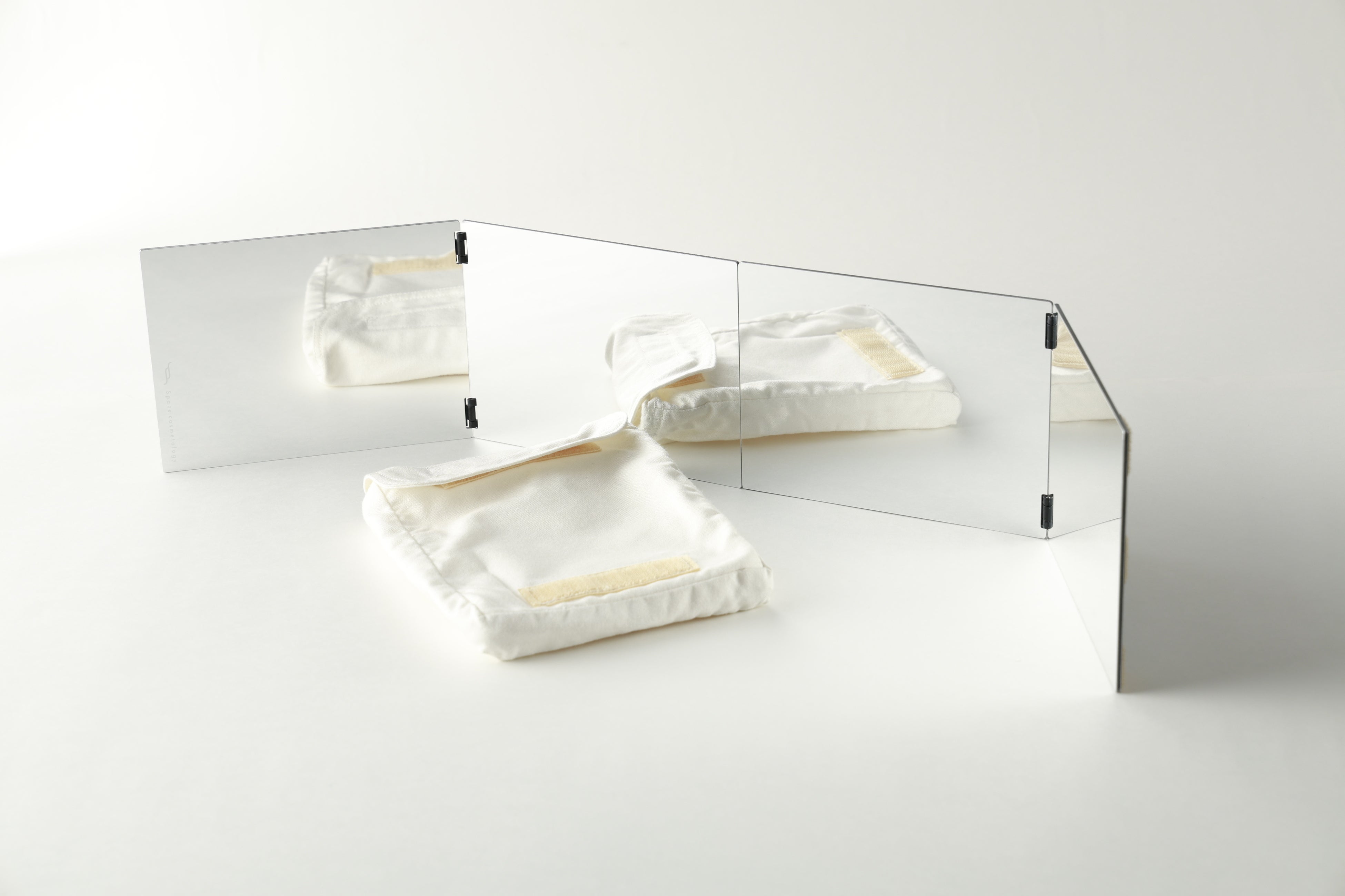 「origami-mirror」(折り紙ミラー)は、折り曲げて3面鏡としても、真っ直ぐに展開し姿見としても使用できる宇宙生活専用の多機能鏡です。小型・軽量・安全・難燃という宇宙での使用条件を満たしながら、宇宙飛行士が自身の身体や表情、髪型、健康状態を確認しやすいよう無駄を削ぎ落として設計されたシンプルな仕様です。