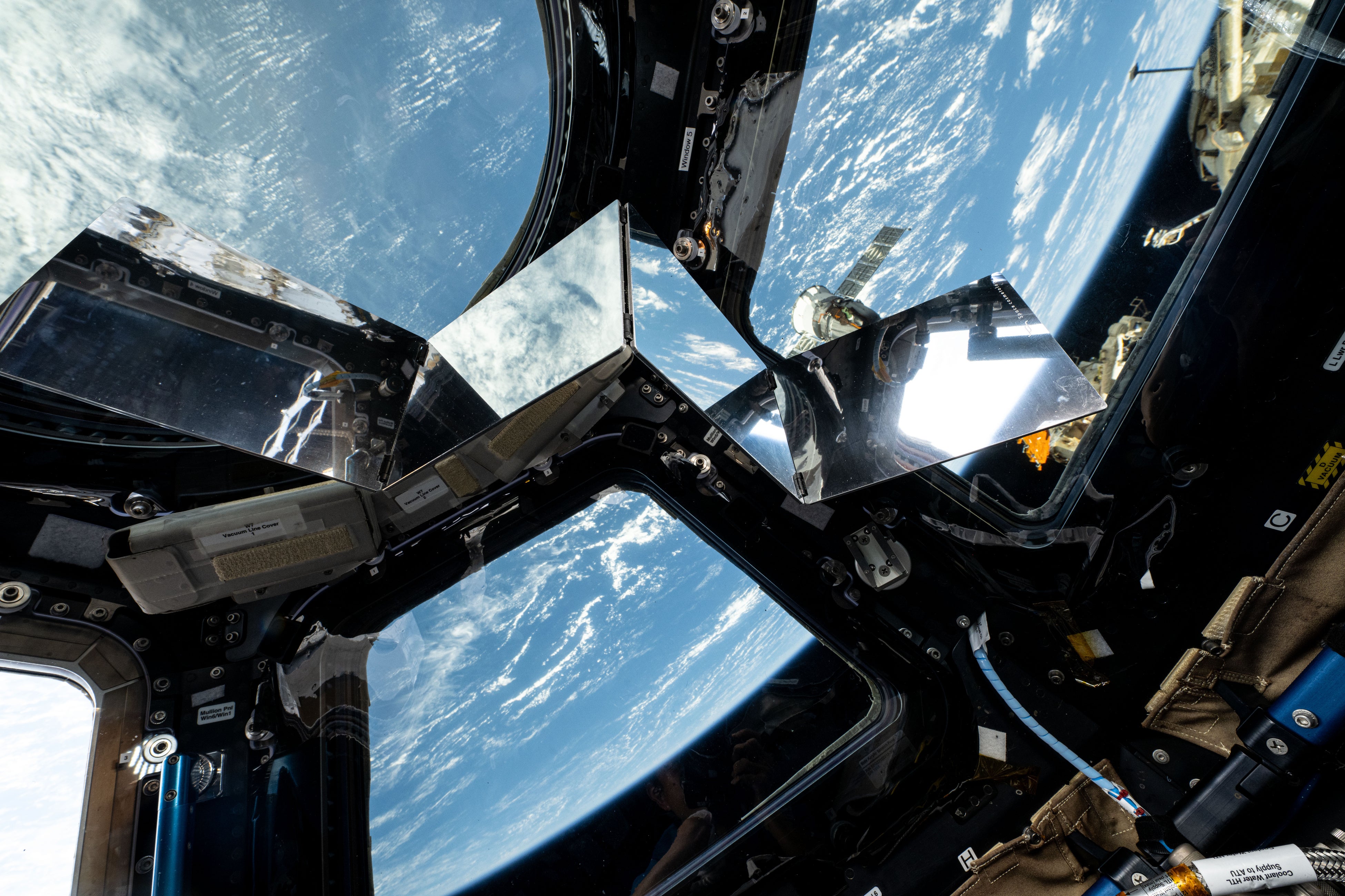 キューポラの窓で撮影された宇宙生活用品のorigami-mirror / 株式会社SPACE BEAUTY LAB (C)️JAXA/NASA