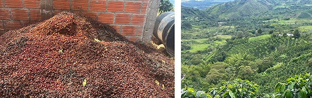 画像提供:コンサベーション・インターナショナル (左)コロンビア・ウイラ地区におけるコーヒー豆の生産残渣((C) Fundecafe) (右)コロンビア・ウイラ地区のコーヒー農園((C) コンサベーション・インターナショナル)