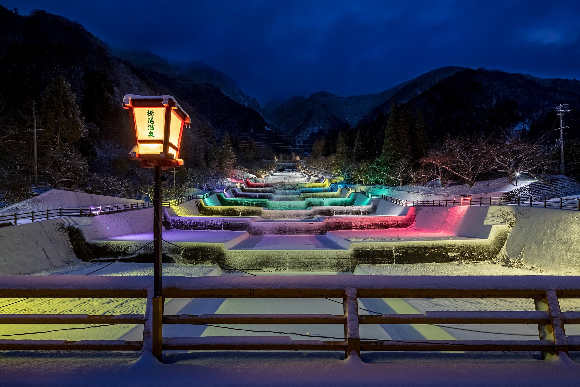 標高1,000メートル超の山間に位置する奥飛騨温泉郷ならではの厳しい寒さが生み出す、巨大な氷柱「青だる」や凍結した滝などの自然の造形美を、色鮮やかなLEDライトで幻想的に演出。温泉街を散策しながら、雪と氷が織りなす幻想的な光景と、源泉かけ流しの露天風呂をお楽しみいただけます。