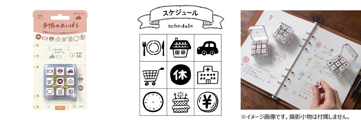 手帳のワンポイントや日記のデコなど色々使える、ミニサイズのハンコセット。持ち運びができる収納ケース入り、色々使える9柄セット。