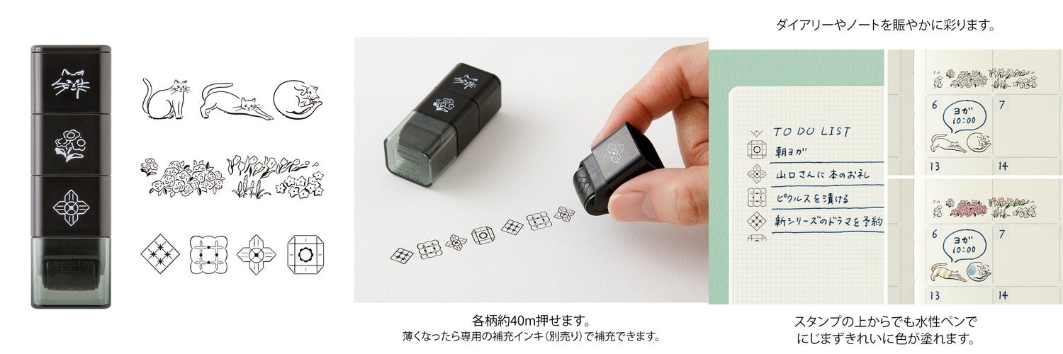 ミドリ ローラースタンプ 各1,760円ノートやダイアリーの記録を楽しむためのローラータイプのスタンプ。連続してポーズをとるネコ柄を中心に、違うモチーフを組み合わせてさまざまな用途で使用できます。これ1つで3つの繊細な柄をきれいに押すことができ、ページにできた余白を賑やかに彩ります。ペンケースにも入るサイズ感で、3種類のスタンプが連結しています。