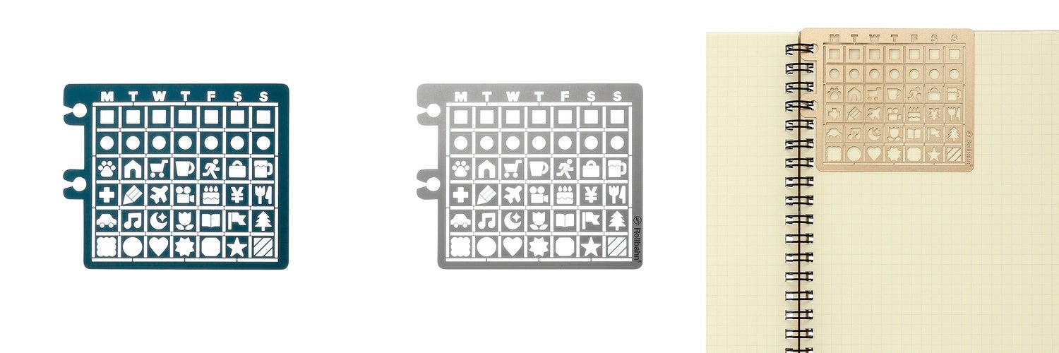 メモページに6週分のカレンダーが描けるロルバーン専用のテンプレート。カスタマイズやスケジュール管理に役立ちます。四角は5mm四方で、ロルバーンポケット付メモの5mm方眼に合わせたチェックボックスを描けます。本体の二か所の穴をリングタイプのロルバーンポケット付メモとロルバーンダイアリー、ロルバーンフレキシブルなどのリングに着脱可能。