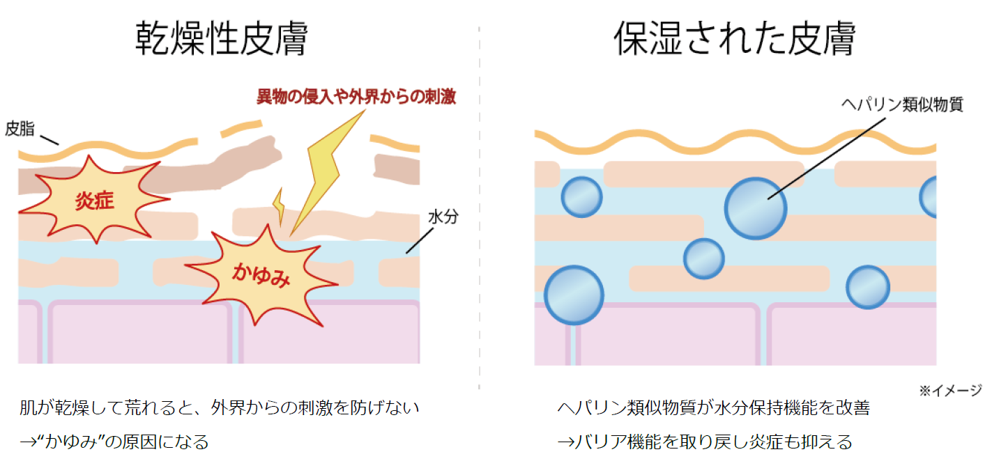 ヘパリン類似物質は、水を保持する性質を持つ親水性の部分を多く持ち、水分子を引き寄せて保持する保水性を合わせ持つことから、高い保湿効果が期待できます。その結果、水分保持機能の改善に繋がり、バリア機能を取り戻して炎症も抑えることができます。さらに、血行促進作用も期待できることから、皮膚のターンオーバーを促進して“きず・やけどのあとの治療”にも用いることができます。