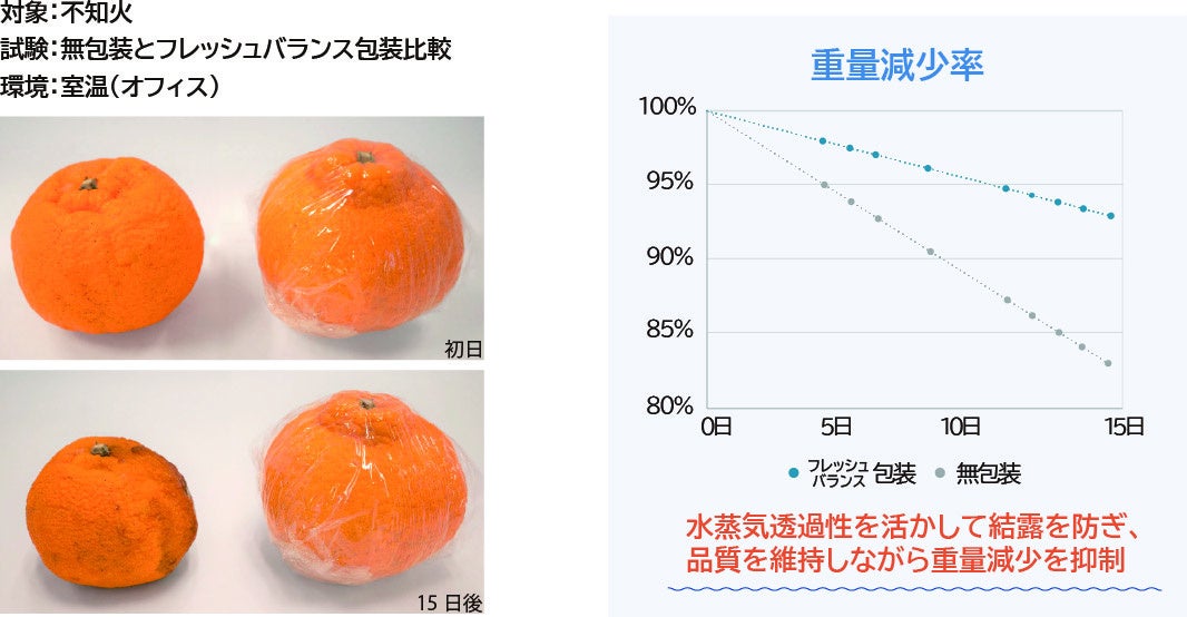 フードロス、農業や運送業における労働力不足といった社会課題を背景に、野菜や果物(青果物)の長期保存需要は高まっています。この課題に取り組むため当社は、ポリメチルペンテン樹脂の性質に着目し、独自の薄膜技術で鮮度保持フィルム「フレッシュバランス(R)」を開発しました。