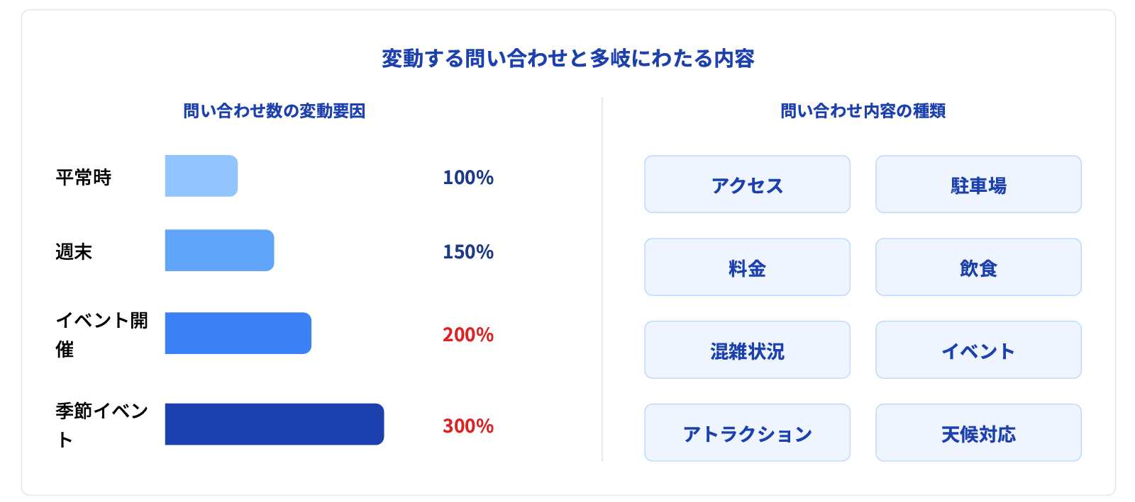 クライアントが運営するアミューズメントパークでは、問い合わせ内容の多様化と、季節・イベントによる需要変動が大きな負担となっていました。