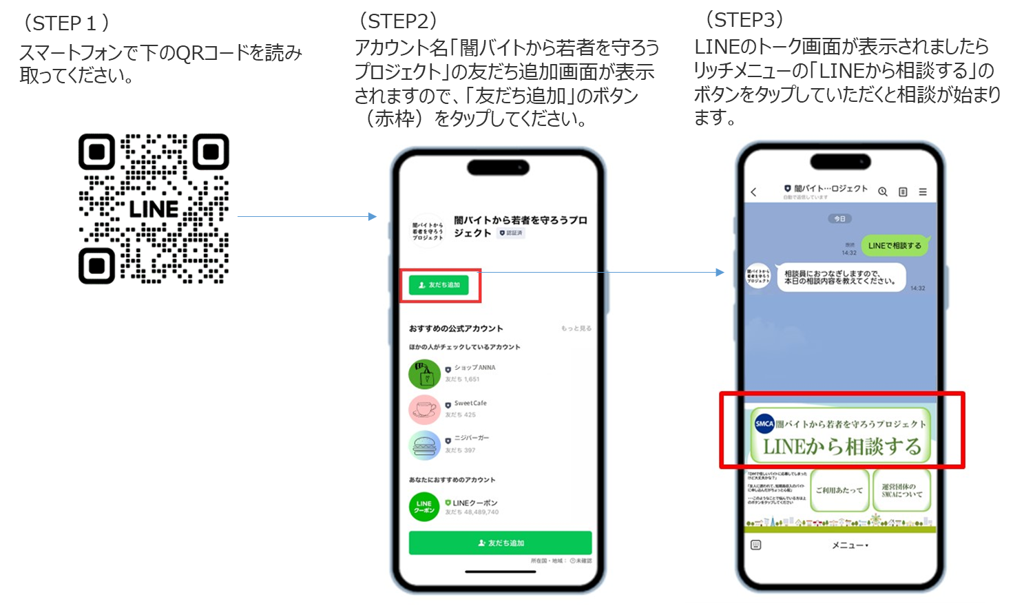 専用のLINEアカウント「闇バイトから若者を守ろうプロジェクト」では、闇バイトに関するご相談について、「全国SNSカウンセリング協議会登録SNSカウンセラー*」が対応します。状況や感情の整理を行い、孤独感に寄り添いながら何ができるかを考え、必要に応じて家族や警察等への相談を促します。